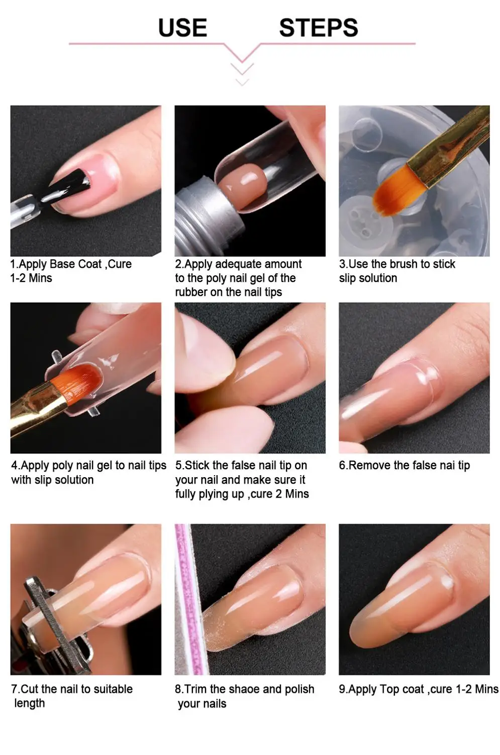 Шаг использования: 1. Нанесите базовый слой, вылечите 1-2 минуты 2. Нанесите достаточное количество на полигель для ногтей резины на Кончики ногтей 3. Используйте кисть для приклеивания раствора 4. Нанесите полигель для ногтей на Кончики ногтей с раствором скольжения 5. Наклейте накладные ногти на ногти и убедитесь, что они полностью увеличиваются, вылечите 2 минуты 6. Удалите ложный наконечник nai 7. Режет гвоздь до подходящей длины 8. Обрежьте шаое и полируйте ногти 9. Нанесите верхнее пальто, вылечите 1-2 минуты