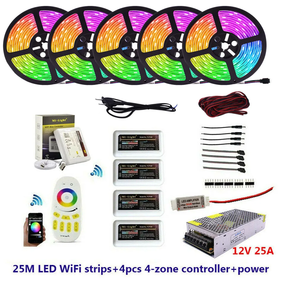 25 м WiFi 5050 RGB /RGBW IP65/IP20 включает в себя:Светодиодная лента 5 рулонов 5 м 5050 IP65/IP20 RGB/RGBW1 шт. 2,4G WL IBOX-1 Wifi контроллер1 шт. 4 зоны группа дистанционного управления4 шт. RGB/RGBW контроллер1 шт. RGB/усилитель RGBW5 шт. 4 контактный разъем с проводом4 шт. штекер постоянного тока1 шт. 25A источник питания1 шт штепсельная вилка США или ЕС1X 25 м 2Pin медный Электрический провод