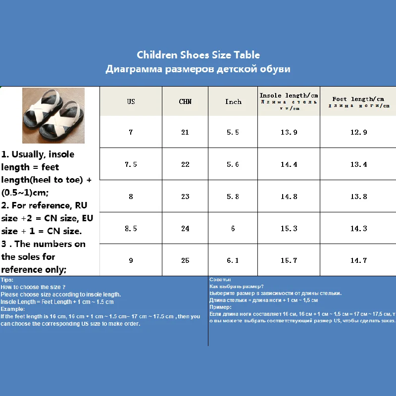 2. Пожалуйста, измерьте длину ступни вашего ребенка, см. Таблицу размеров, а затем выберите обувь для вашего ребенка. Если у вас есть какие-либо вопросы, пожалуйста, свяжитесь с нами, и мы сделаем все возможное, чтобы сделать для вас!
