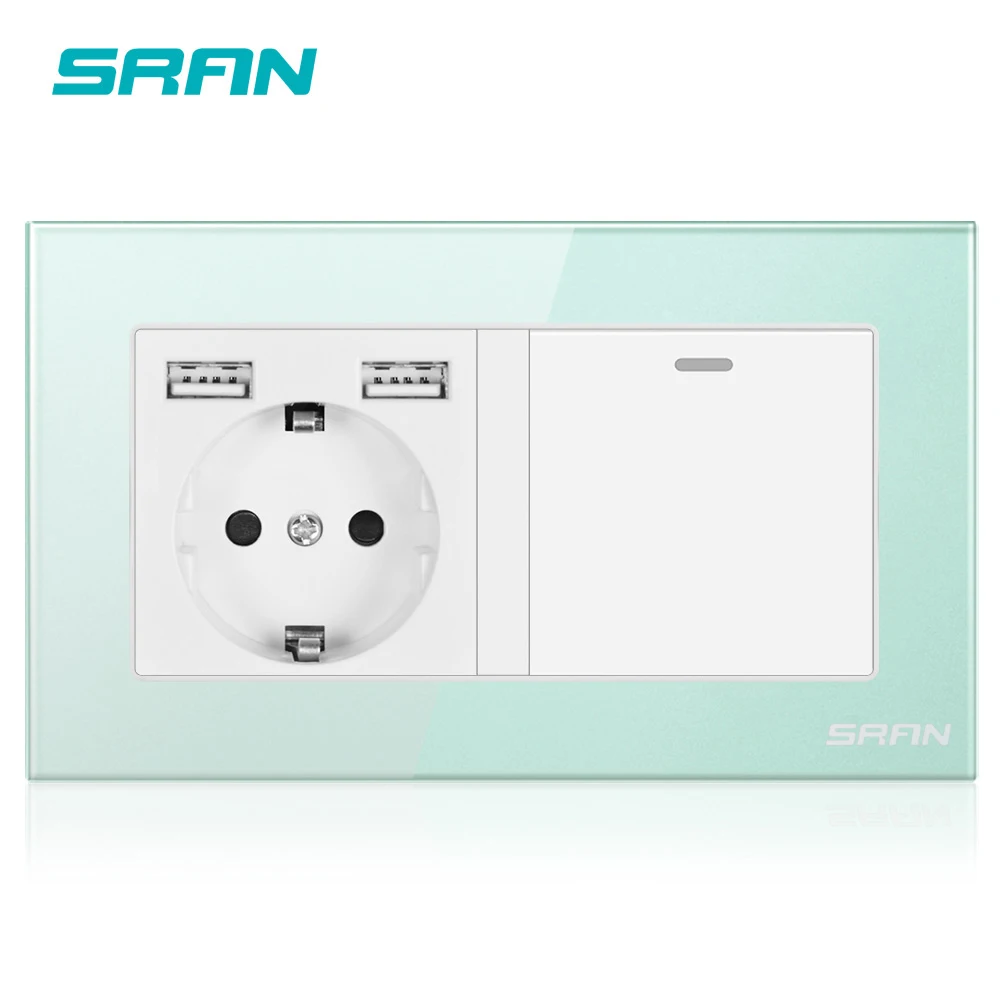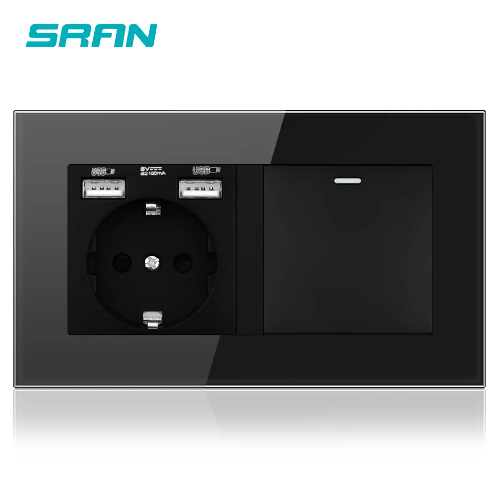 SRAN Европейская Сетевая розетка с кулисный переключатель, 220v 16A Розетка с usb 146*86 с украшением в виде кристаллов стеклянная панель с светильник выключатель 1 ряд 1/2/3 путь