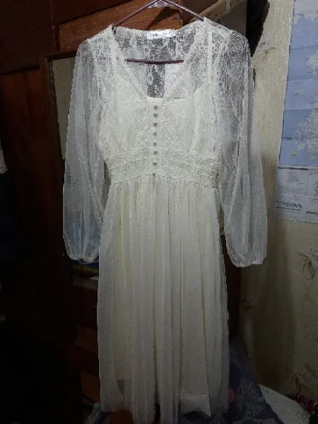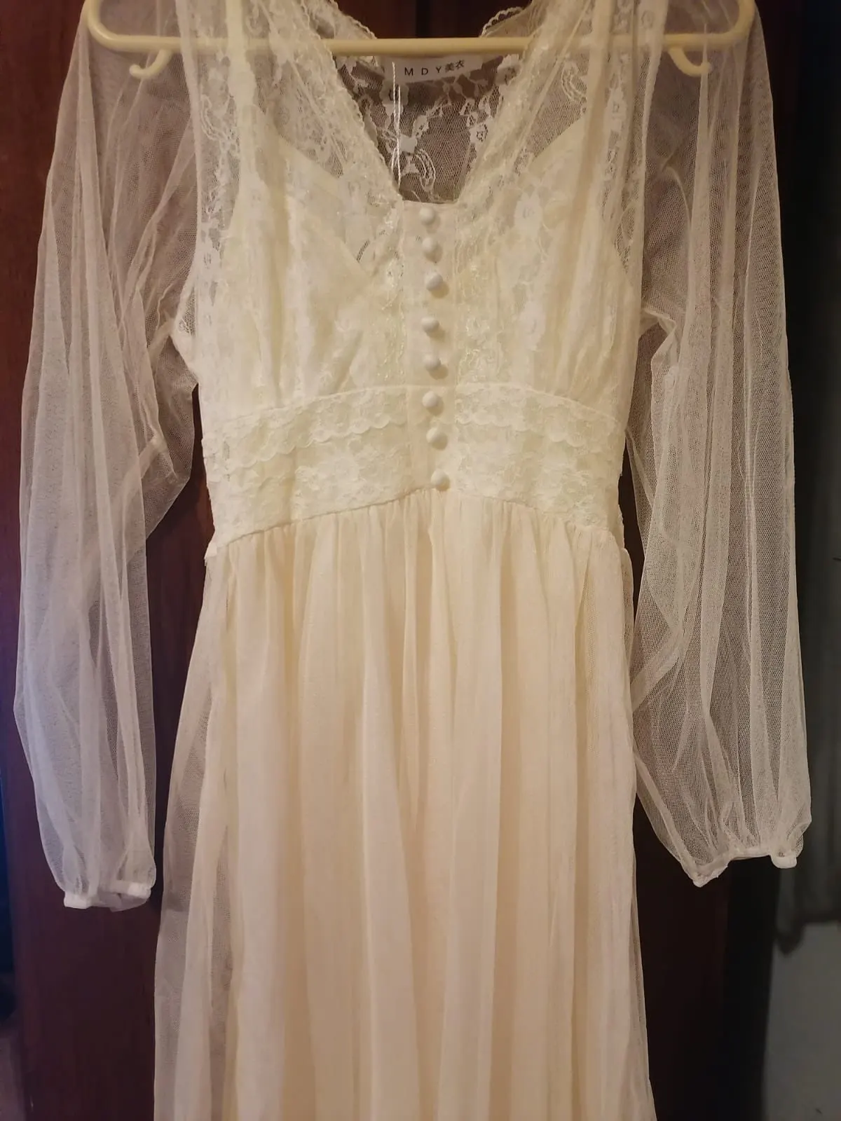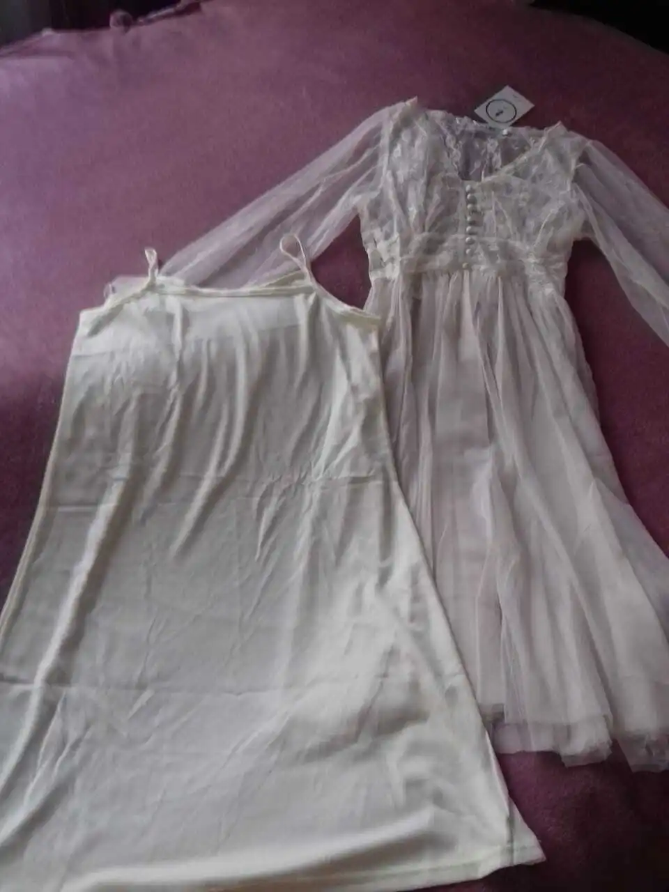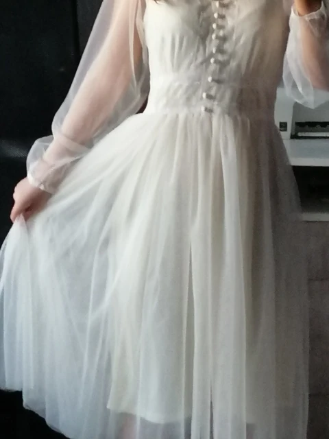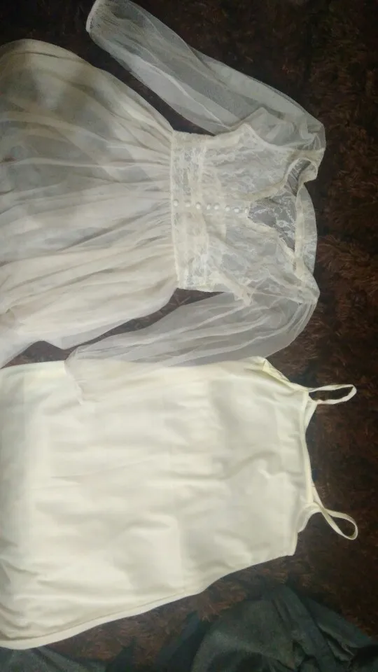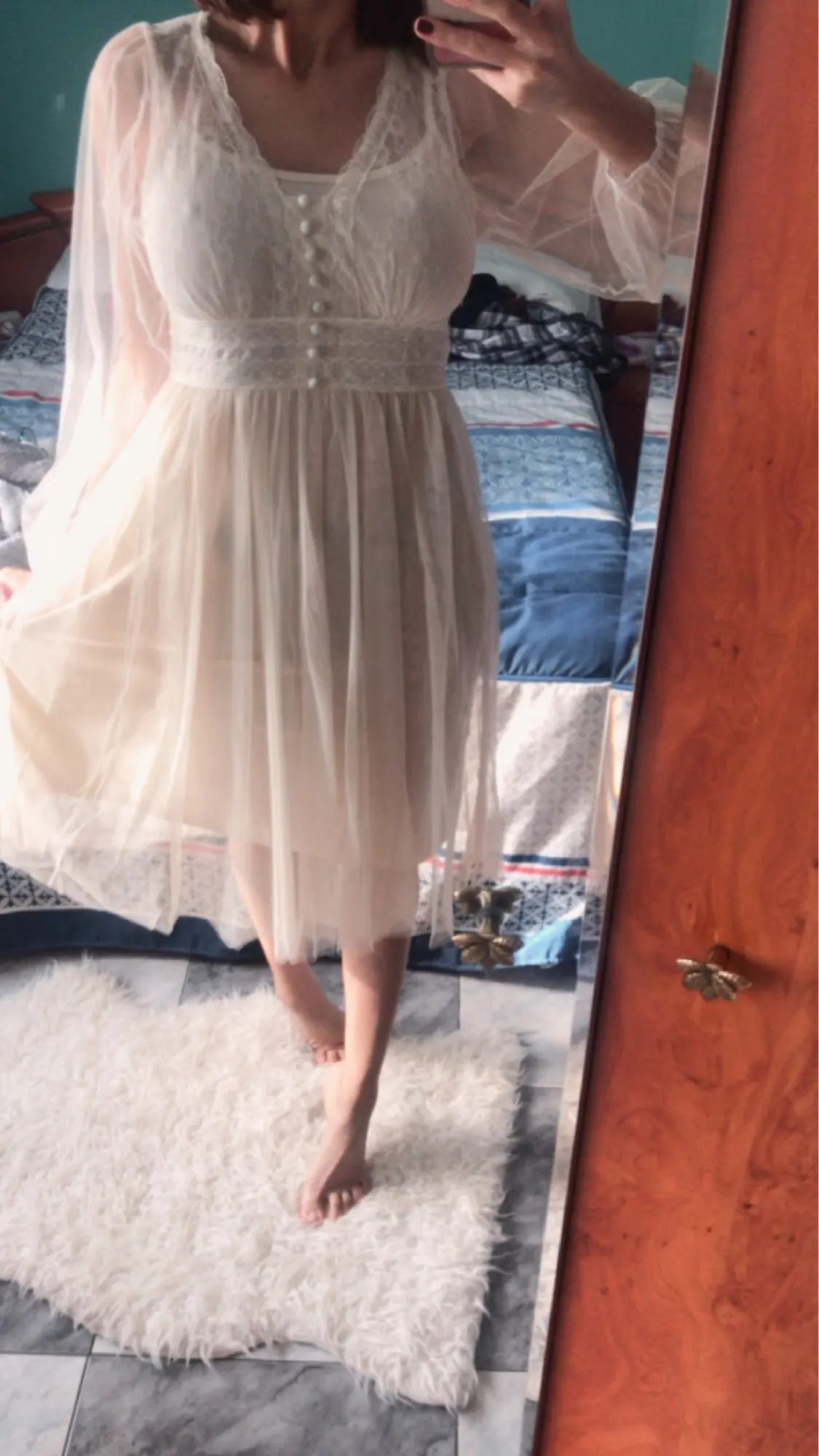 Мне понравилось! Я взял размер s и мои измерения: Бюст 82 см Талия 66 см Бедро 90 см Мне 1 '58 см, и он пришел прямо к моему колену. Это было прекрасно, ни слишком туго, ни слишком свободно. Это бежевый, а не белый. Принесите две части: своего рода платье ремней, а затем платье с длинными кружевными рукавами. Он прозрачный, так что, на мой взгляд, желательно носить белую или аналогичную нижнее белье. Принесите невидимую молнию сбоку и она не эластична. Посылка прибыла на неделю раньше срока. Очень очень доволен платьем!