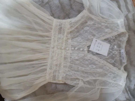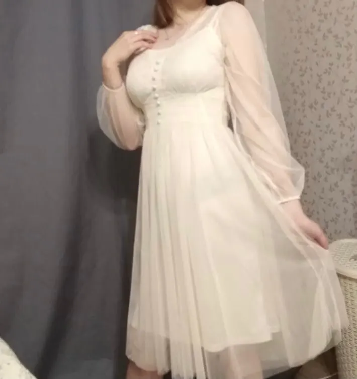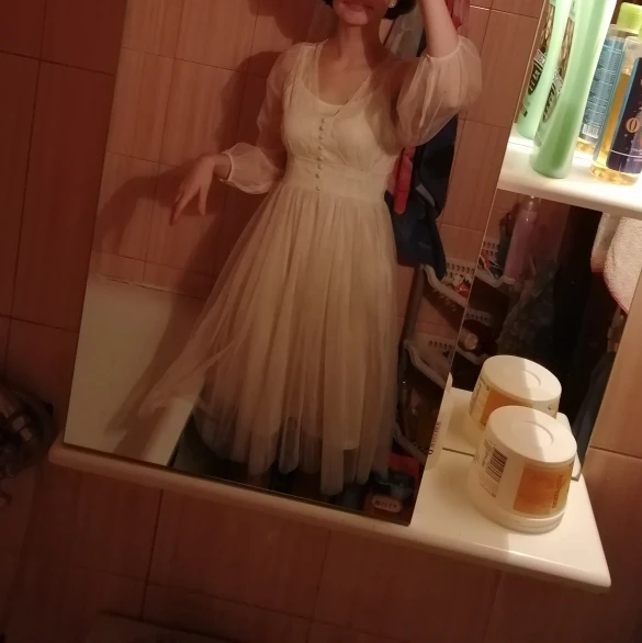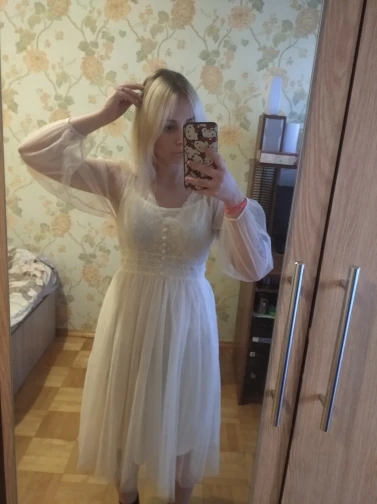Сетчатый верх молочного оттенка, под него пришло лёгкое платьице на лямках. Хорошо просвечивает. Ношу XS (рост 160) переживала, что будет мало, взяла S в итоге влезла в платье не расстегивая молнию. Дошло до Владимира за +-10 дней