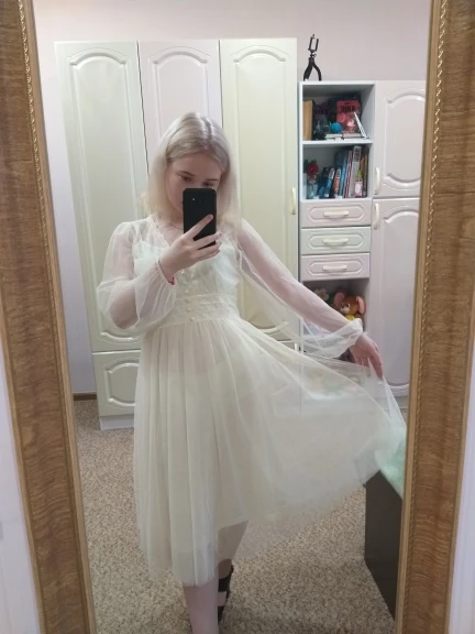 Хорошее, лёгкое и очень нежное платье. Немного торчат нитки, но это не проблема. Цвет на самом деле кремовый, так даже лучше. Придраться могу только к скорости доставки, потому что у товара она plus, а платье пришло спустя 30 дней после оплаты...