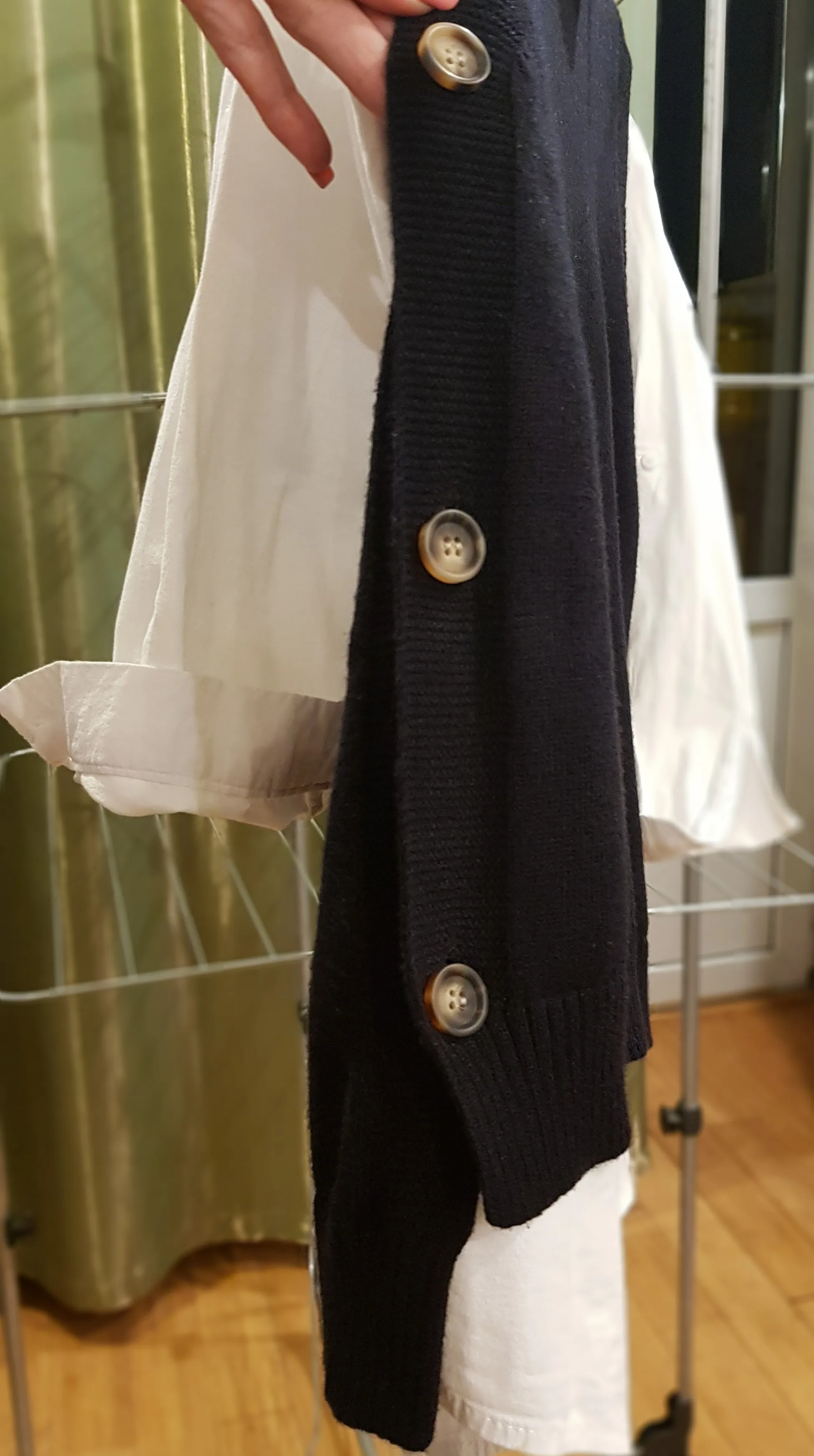 Размер ХХХL хорошо подошел на 50-52 размер. Не в облипку, не оверсайз, в меру свободный. Думаю, что здесь не кашемир, а шерсть с добавками. Боюсь образования катышков, в носке еще не пробовала. Выглядит очень хорошо.