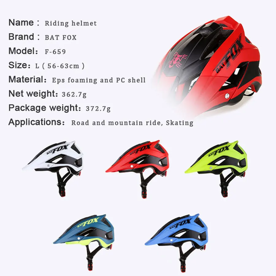 BATFOX 2019 новейший велосипедный шлем для мужчин и женщин мужской дорожный горный MTB шлем сверхлегкий интегрированный велосипедный шлем Casco CiclismoПодробная информацияПол: Сверхлегкий шлем унисексМатериал: Поликарбонат + ЭпсВес: около 362 гРазмер: L 56-62 смЦвет: 5 стилейФункция: наружная защитаХарактеристикаДышащая Удобная Амортизация14 вентиляционных отверстий, использование воздушного охлаждения делает воздух свободным.Анатомический дизайн, двухсторонняя бархатная защитная накладка, простая в использовании, с волшебной пряжкой.
