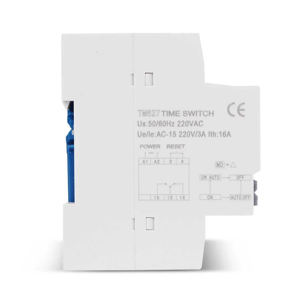 Переключатель времени TM627 применим для регулярного управления включением и выключением цепи. Режим замыкания может быть установлен в группу времени циклического включения/выключения, работа цикла в зависимости от времени установки.