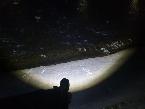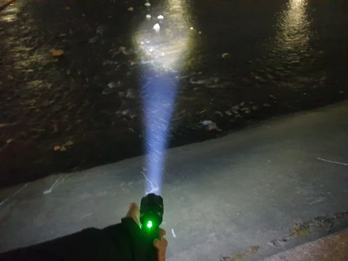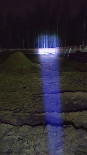 Фонарь светит как сумашедший)) Действительно крутая вещь, полностью из алюминия, но при этом увесистый и его приятно держать в руке, сделан оч качественно. Фонарь освещает местность лучше, чем у меня машина новая с включённым дальнем светом. На фото забор и лес находится в 70 метрах от меня, освещает как днём. Есть фокусировка, её на фото видно, освещает либо большую площадь вокруг, либо широким лучом в даль. Покупкой я очень доволен, супер
