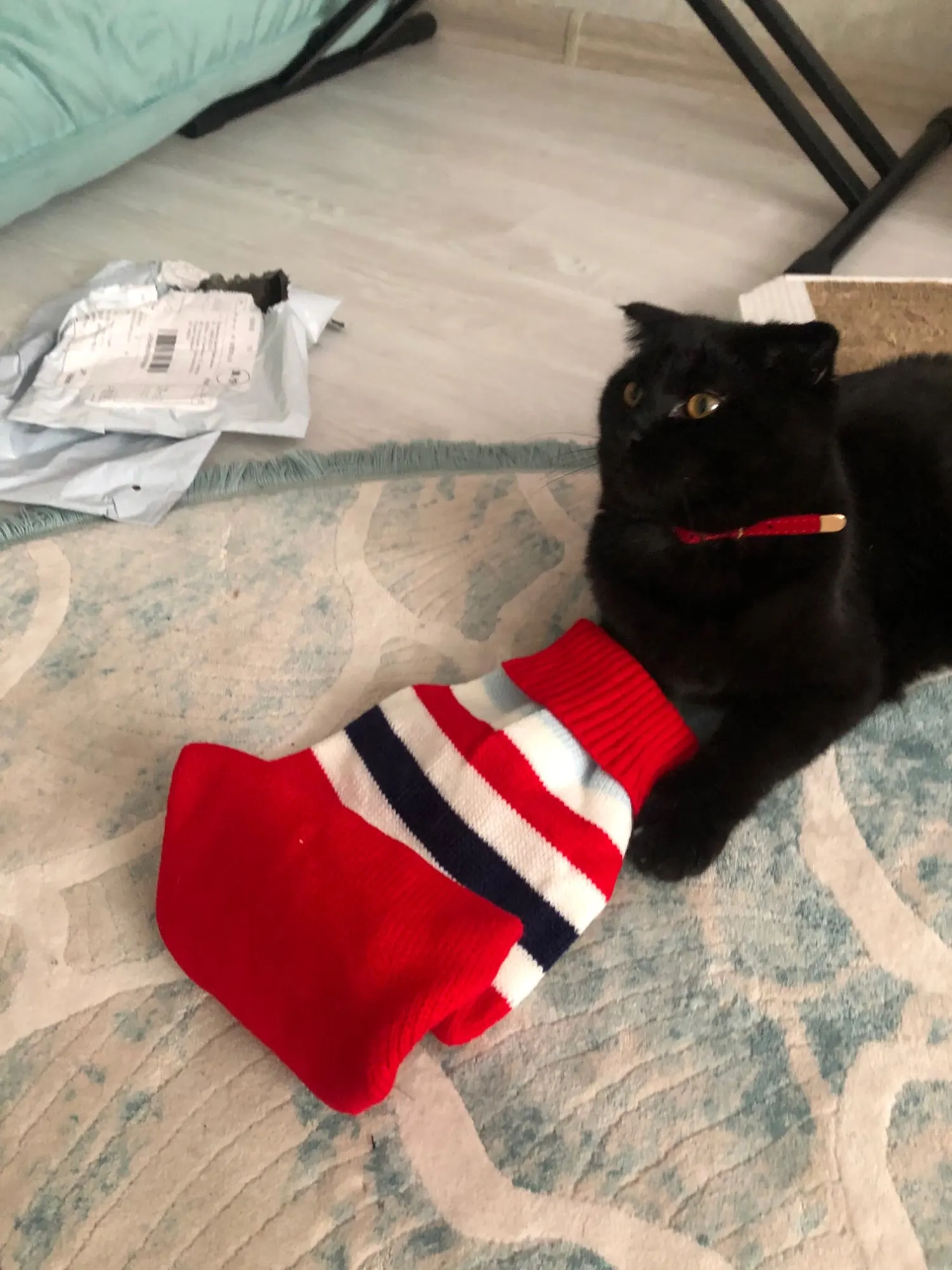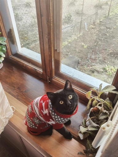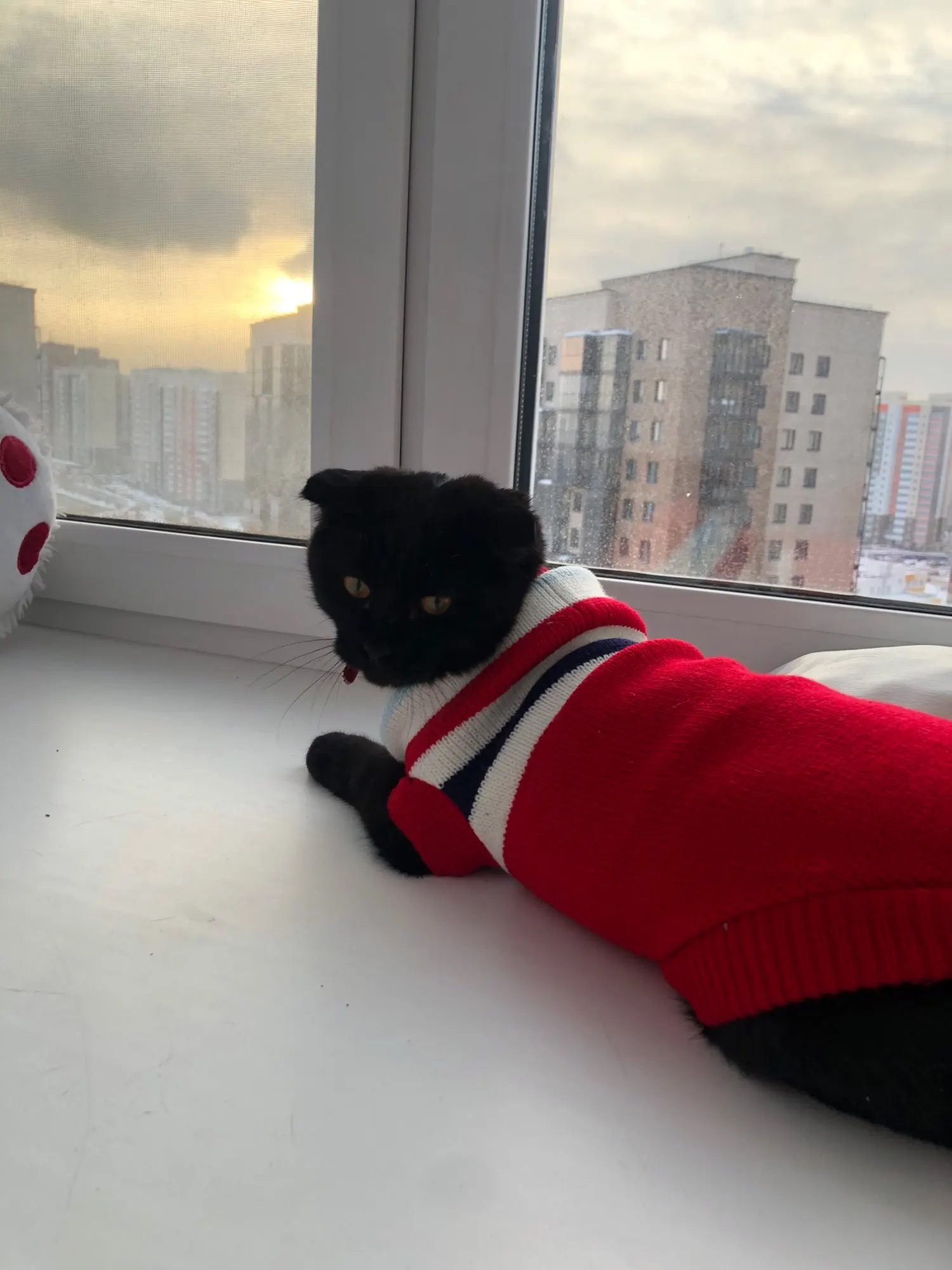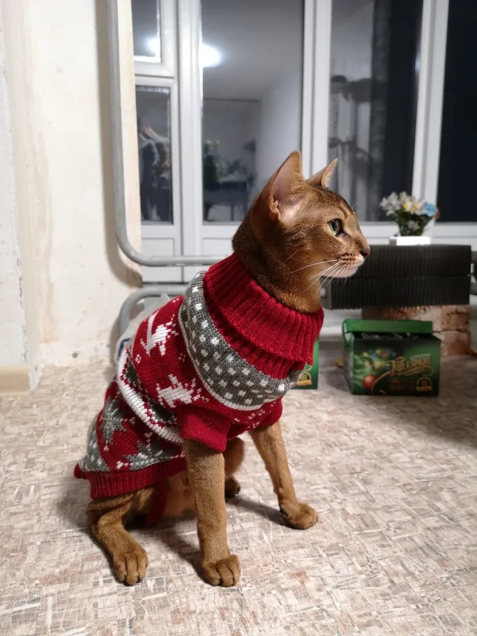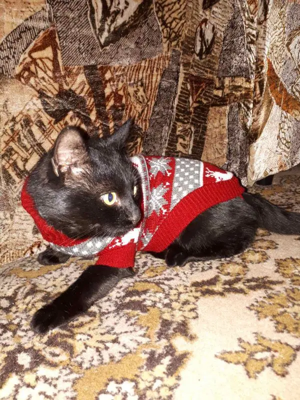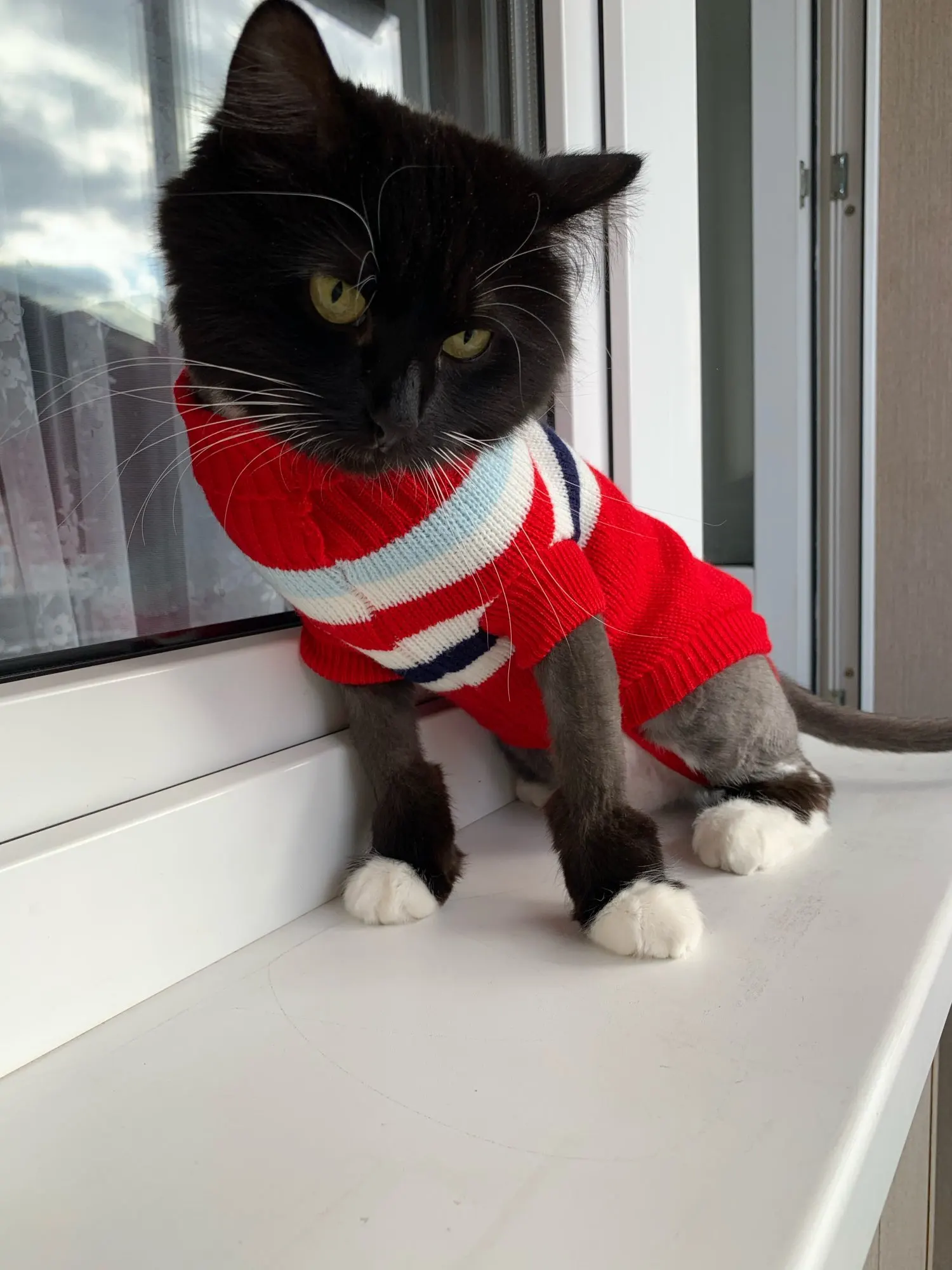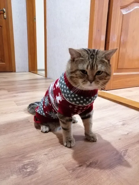 Очень классный свитер! Все в размер, доставили за месяц в Санкт-Петербург. Я очень довольна, кот не совсем, но ему придется кот иногда умудряется высовывать передние лапы, он это делает, что потягиваться, а так ему тепло и он просто кайфует сама бы такой свитер носила, цвет, качество, все, как на картинке!
