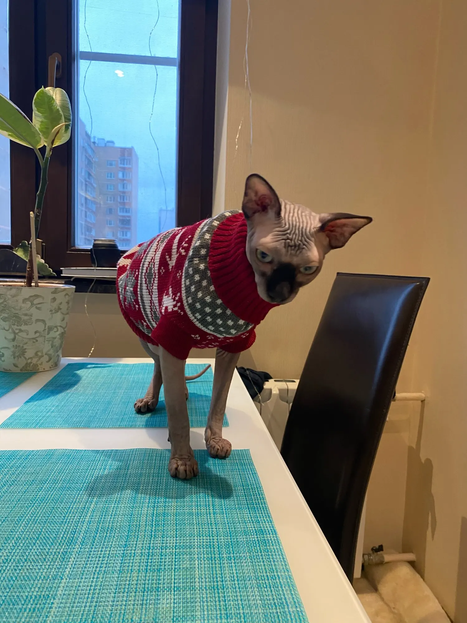 Свитер красивый, мягкий, но мне кажется, немного коротковат по длине, хотя брала размер 8 на 4-месячного сфинкса. Поносим пока всё равно)