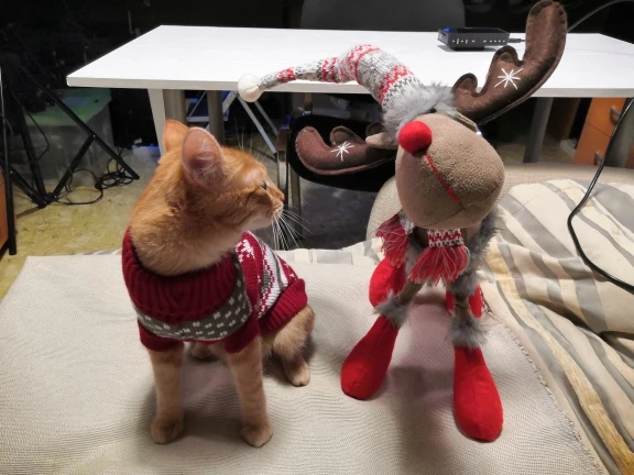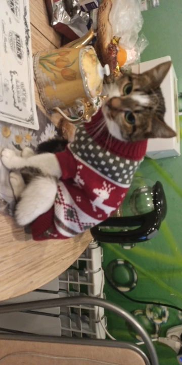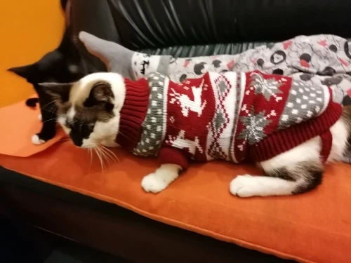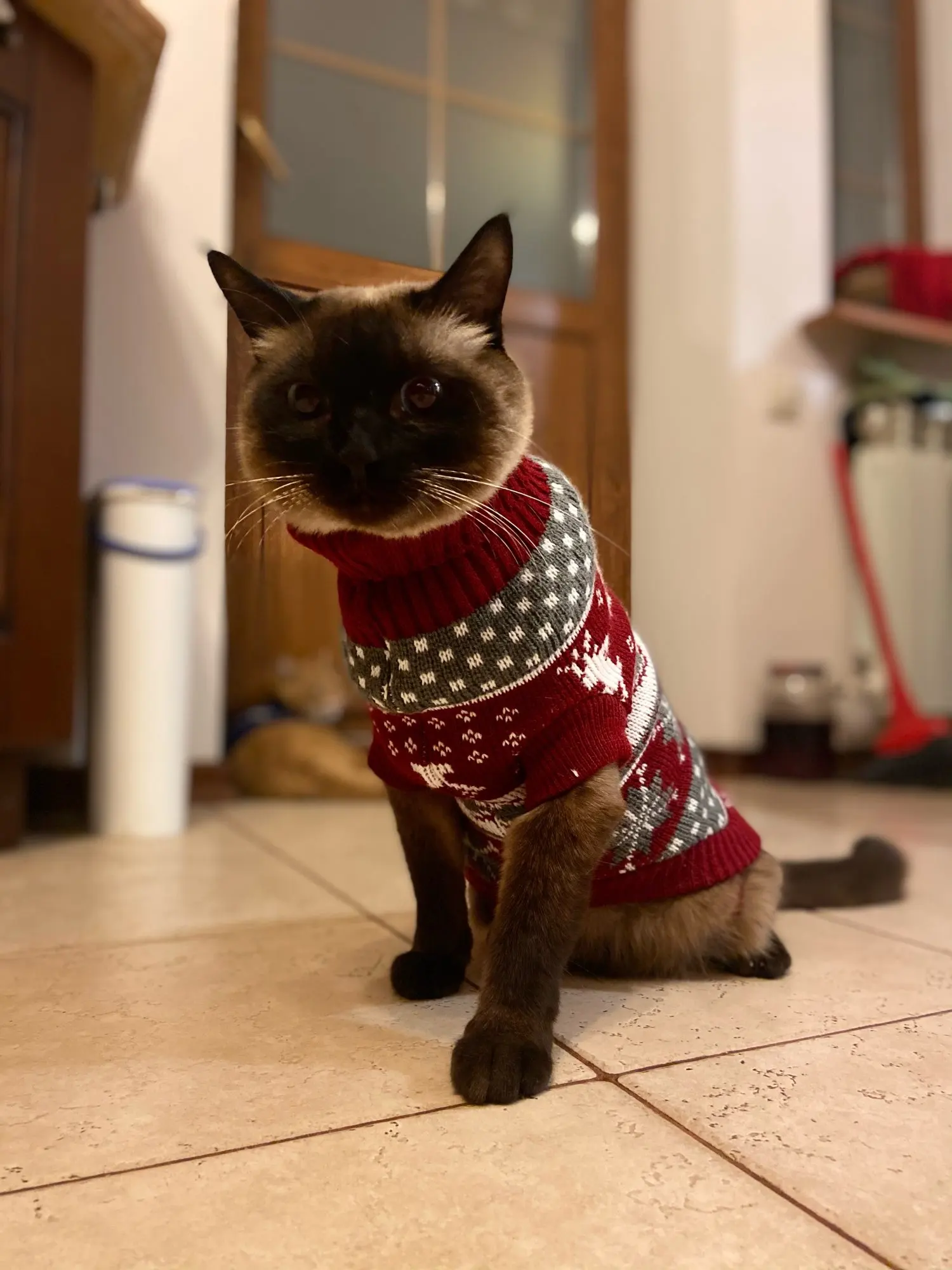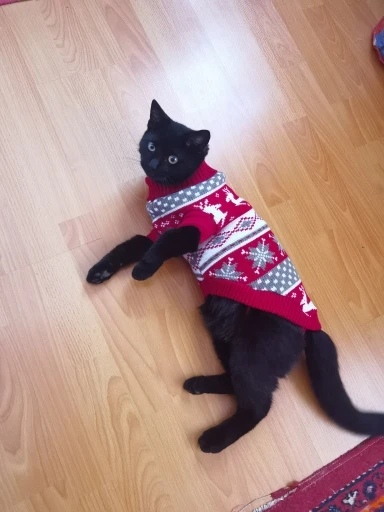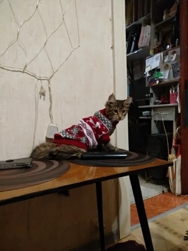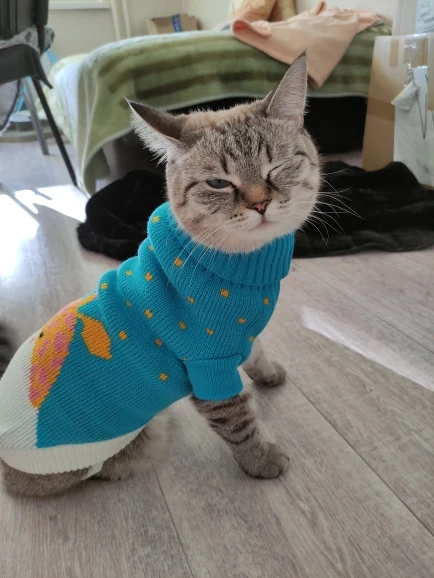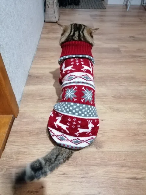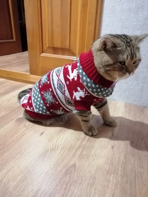 Заказывала сразу несколько свитеров для котёнка, и этот один из лучших! Идеальная длина на все тело, лямки под задние лапы, красивый рисунок, мягкий материал. Наш котёнок пока не оценил, ей некомфортно находится в одежде, но ей ничего не жмёт, будем приучать.