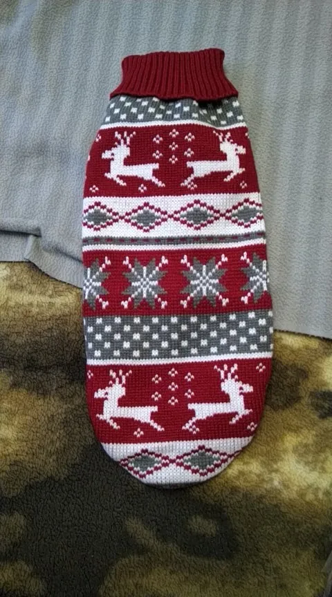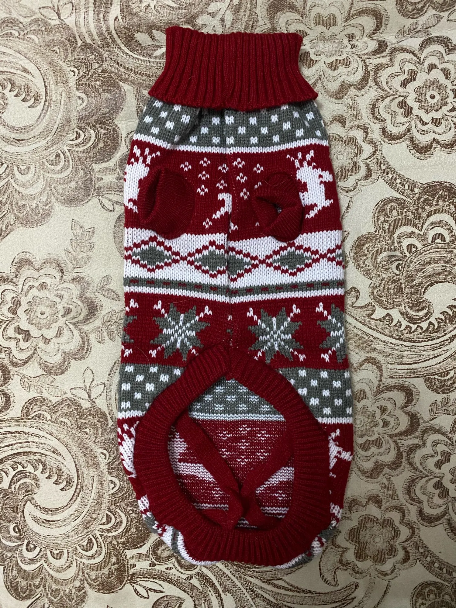 Свитер хороший, не пахнет и узор как на картинке. Тянется не сильно и выглядит красиво, есть специальные веревочки чтобы лучше держатся на задних лапах. Нам он очень понравился правда рассчитывал что по длине он будет примерно такой же как на фотографии, но все таки оказался длинноват, зато сзади на прогулке не будет мерзнуть.