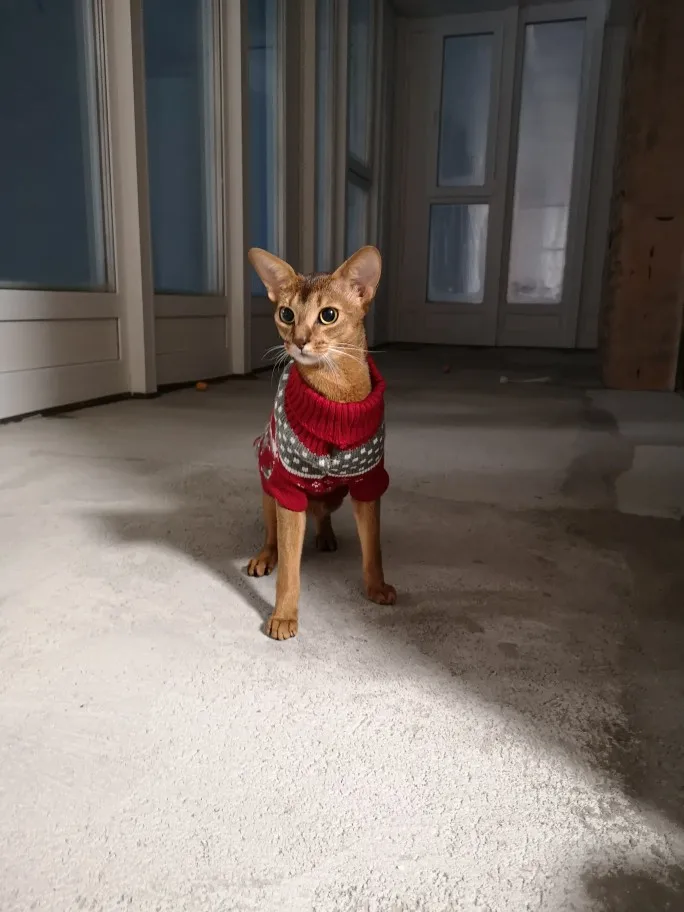 Свитерок очень хорошего качества. Немного не угадала с размером, чуть коротковат, из-за чего не стали надевать лямки на задние лапки, коту неудобно. Испытали на дальнее расстояние, кот не замёрз и это главное.)))