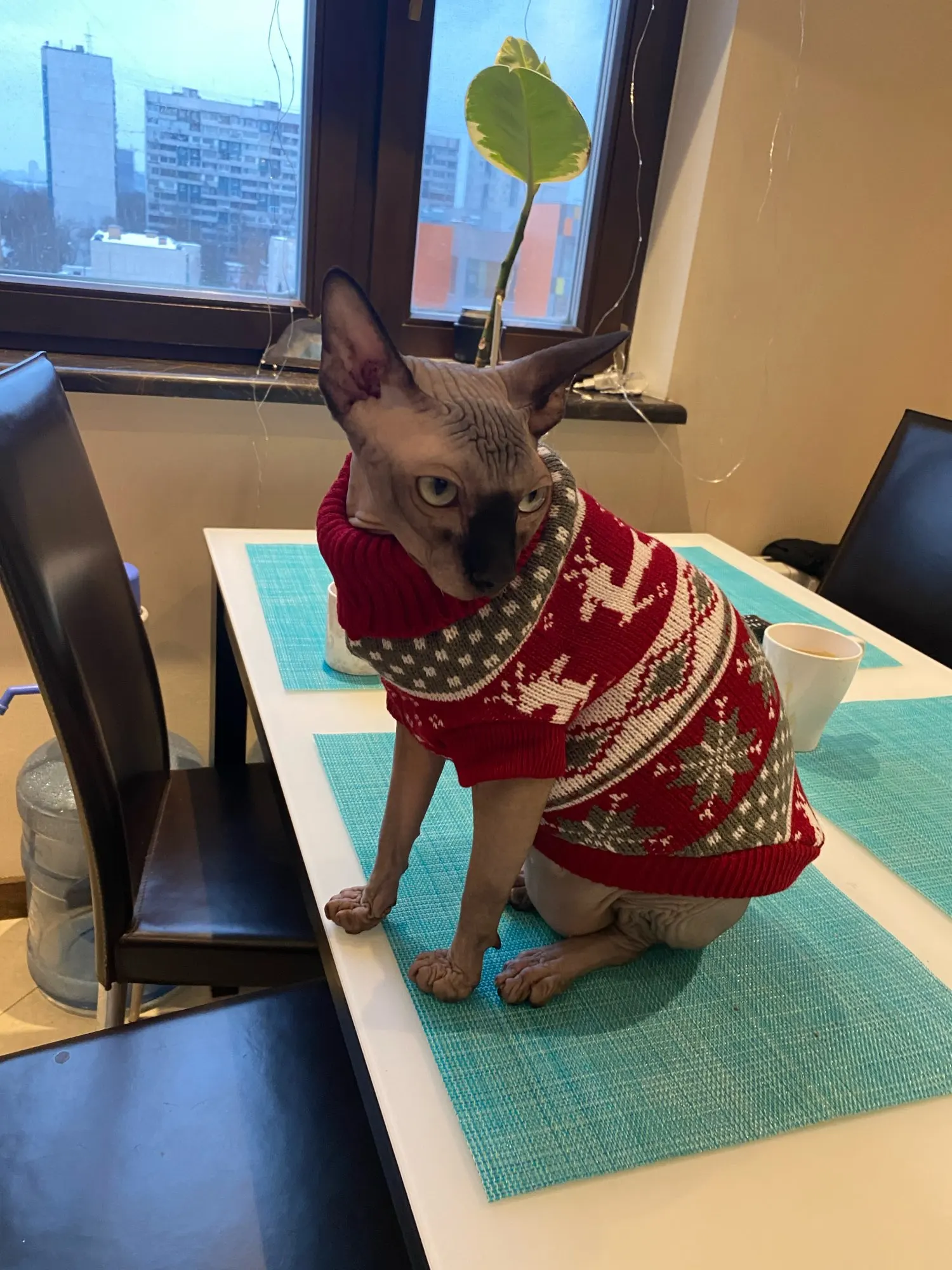 Мой лысый кот доволен! Свитер очень мягкий, качественный. Кот весит 4,5 кг, средний размер сидит идеально!