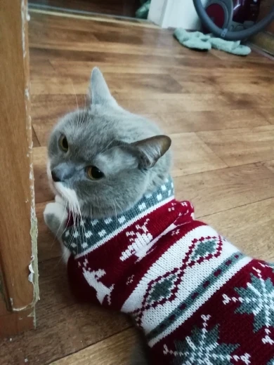 Это что-то с чем-то! Надели на кота и все))), он даже ходить перестал! Может привыкнет))). Хороший свитерок, мягкий, без запаха)!