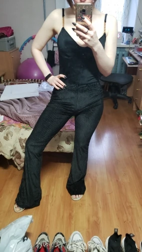 Я 1m64, а длина штанов немного длиннее, но с маленькими высокими сапогами или каблуками это идеально! Брюки очень удобные в носке, а материал очень мягкий! Брюки немного прозрачные, но мы практически ничего не видим, только свет дня! Я получил свой обычный размер, и он мне подходит: 3