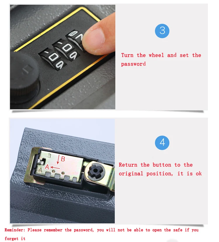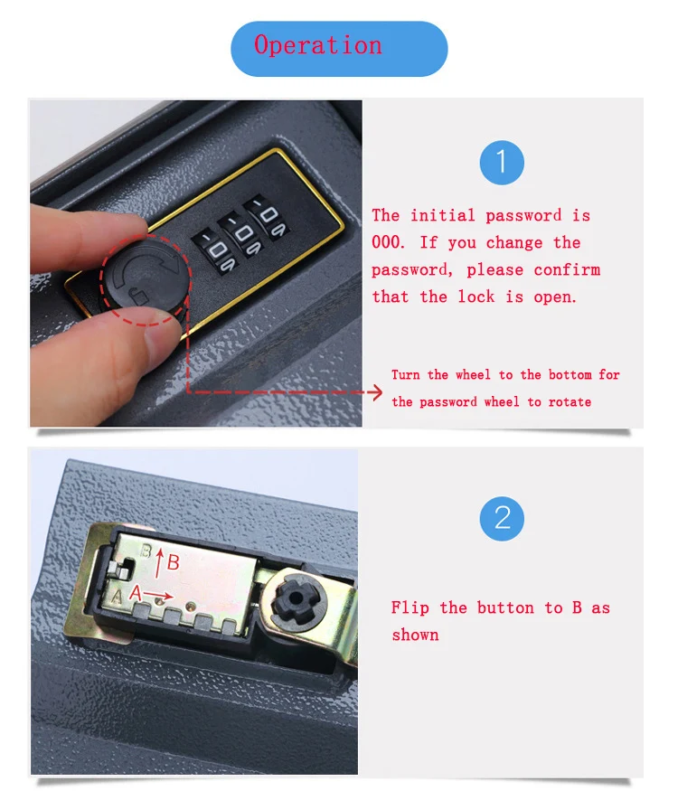 1. Изначальный пароль-«000». Перед сменой пароля убедитесь, что замок открыт, и поверните ручку слева от кодового колеса, чтобы разблокировать его. 2. Поверните ключ на задней части комбинированного замка в положение B 3. Поверните колесо пароля и установите желаемый пароль 4. Верните клавишу с задней стороны комбинированного замка к A, и настройка завершена.