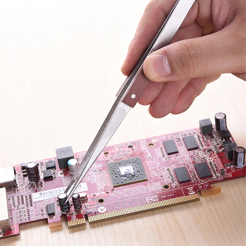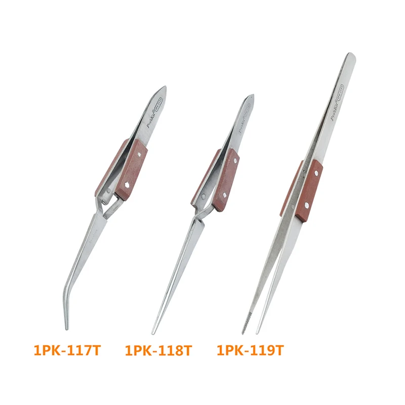 Пинцет Pro'sKit 1PK-119T с деревянной ручкой из нержавеющей стали, изогнутый Пинцет обратного действия, крестообразный Пинцет для пайки, прецизионные инструменты для ремонта