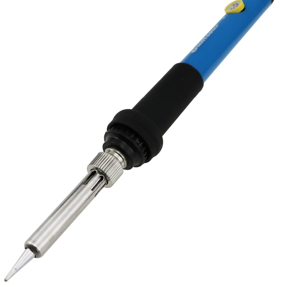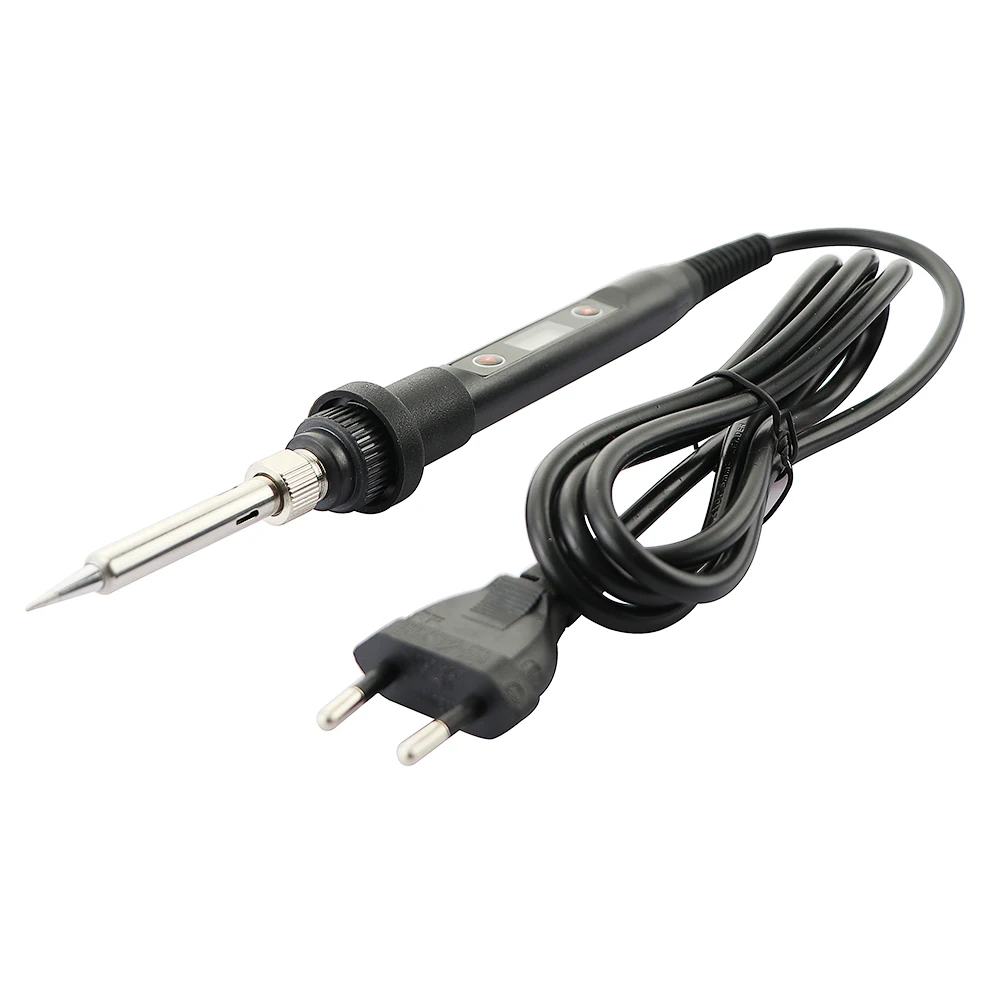 Он изготовлен из металлического наконечника и нержавеющей стали, обеспечивает качество продукции и свойства стабильности и надежности. Паяльник с регулируемой температурой s: 200-450 градусов по Цельсию, есть специальная схема термостата для контроля температуры, и вы можете регулировать температуру в соответствии с вашими потребностями колесом ручки на электронном паяльнике