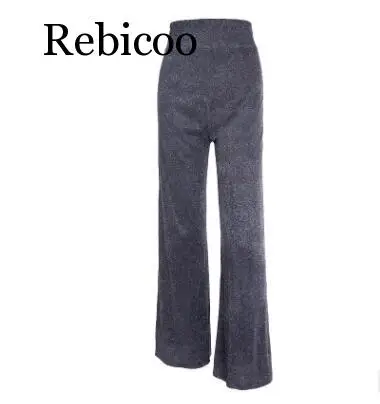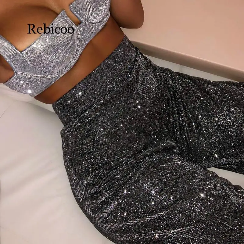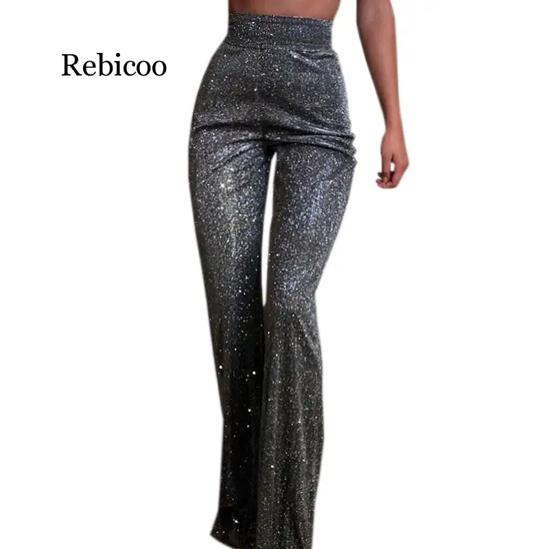Пикантные серебристые женские туфли-лодочки с блестками, яркие брюки вечерние Для женщин брюки-клеш Высокая Талия Светоотражающие Брюки с широкими штанинами застежка-молния Серебро длинные брюки Mujer