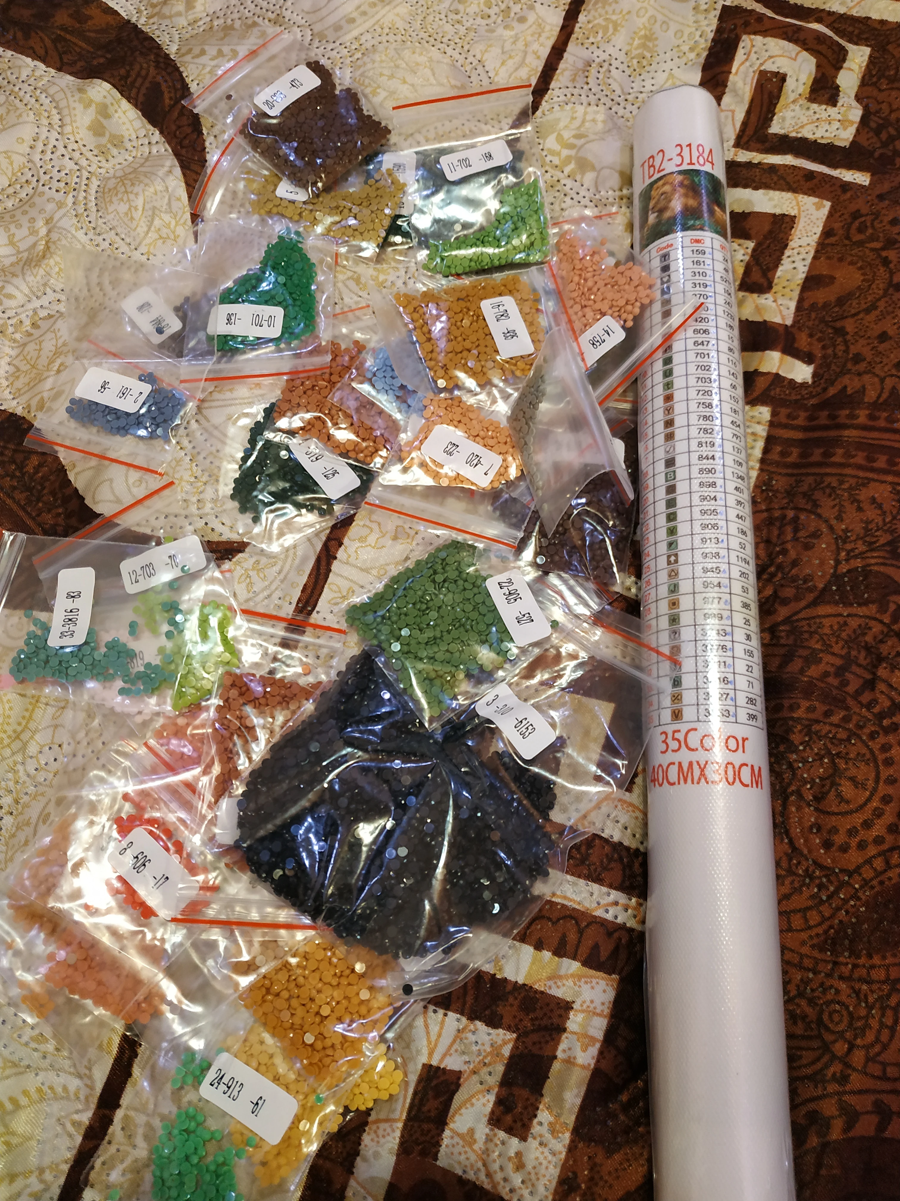 Впервые так разочарована посылкой с картиной. Картонная упаковка вся смята, один пакет со стразами был немного приоткрыт и поэтому стразы валялись везде... Надеюсь, что этого цвета положили с излишком и его хватит для выкладки. Само полотно хоть и намотан на мягкий валик, но есть вмятины в середине и по краям. Понравилась комплектация инструментов, удобно будет выкладывать картину. Доставка менее месяца.