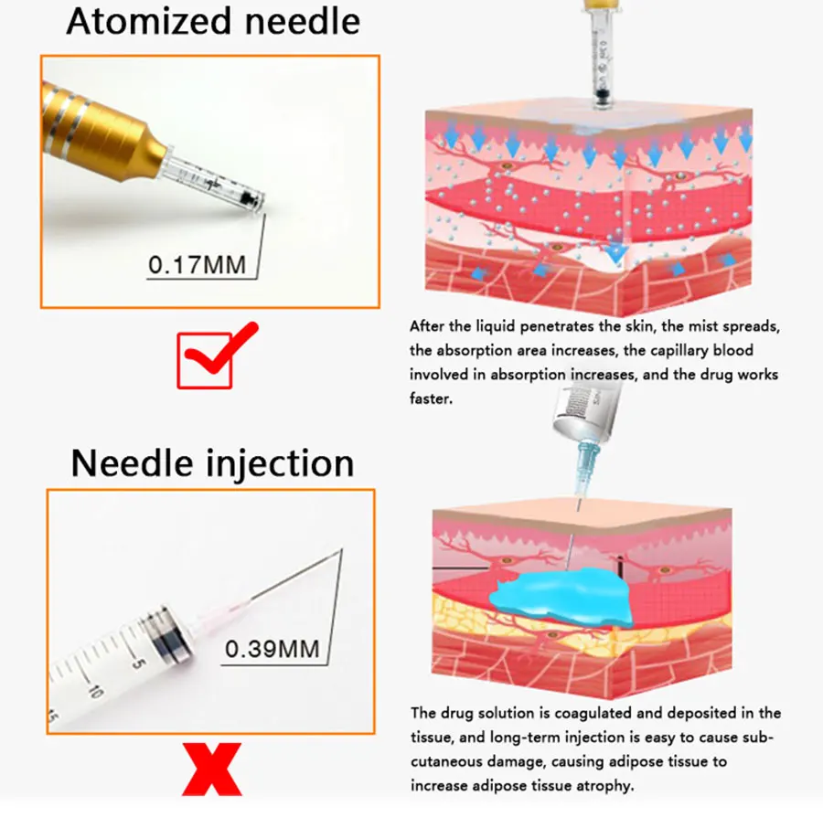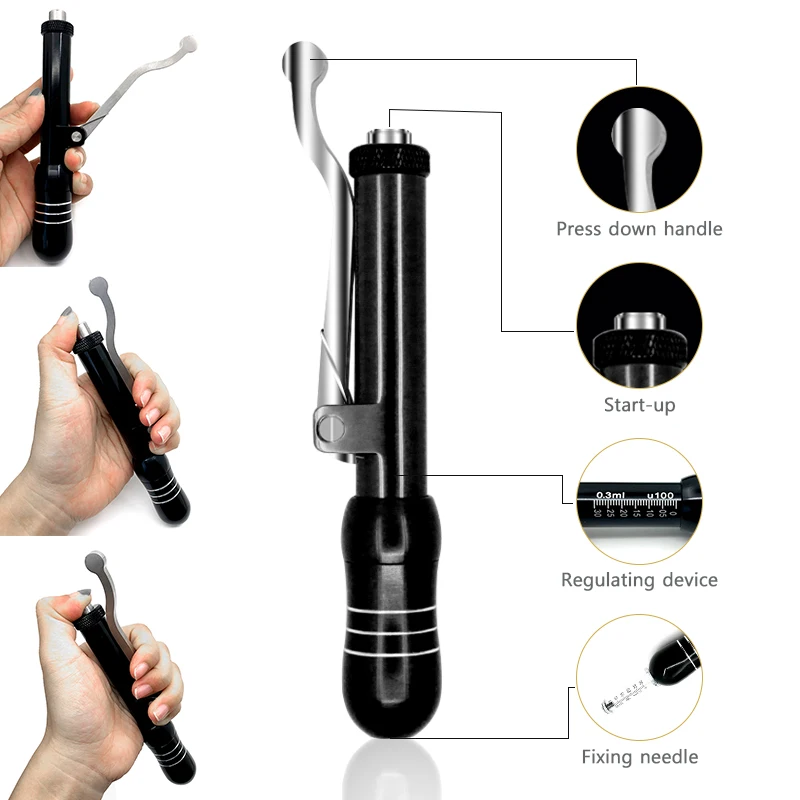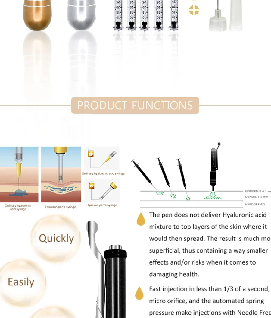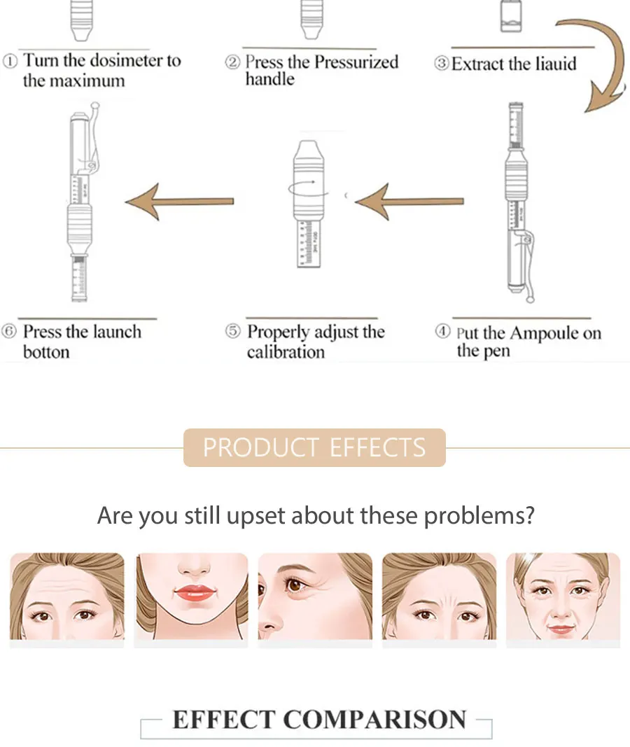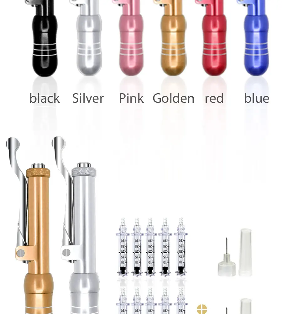 Что такое ручка гиалурона?Водная мезотерапия заключается в впрыскивании гиалуроновой кислоты в кожу. Гиалуроновая кислота содержит влагу, в 200-300 раз более богатая, чем тело. Благодаря чему кожа становится гладкой, мягкой, яркой и увлажненной после инъекций. Для того, чтобы сохранить кожу увлажненной, дамы всегда выбирают различные продукты по уходу за кожей. На самом деле, продукты по уходу за кожей только увлажняют влагу на cutin. Так что при размазывании эти продукты не могут глубоко обеспечить влагу для кожи. Как мы знаем, акне, морщинки и неэластичность появятся, если кожа не будет влагой. Водная мезотерапия решает все проблемы из-за отсутствия влаги, таких как шеллоидная кожа, цветовое пятно, морщинки... И он обеспечит влагу для дермы. Поэтому водная мезотерапия хорошо работает на отбеливании, увлажнении и обновлении неэластичности. Характеристики:Название продукта: ручка для инъекций гиалуронаМатериал: нержавеющая сталь 304Особенности: морщинки, подтяжки лица, подтяжки кожи и т. Д. Особенности:-Помогает уменьшить пятна, морщины и следы. Функция подтягивания и наполнения-Увеличение уровня коллагена для создания новой и молодой кожи, что обеспечивает омоложение кожи.-Улучшает кожу, восстанавливает эластичность кожи, улучшает старение.-Может сделать Антивозрастные продукты попадают в глубину кожи, не повреждая кожу, без побочного эффекта, безопасно для использования.-Глубокое Пополнение и богатое питание, укрепляет кожу, чтобы впитать продукт красоты.-Он используется для более чем 10000 инъекций, и Он управляется самоприводной пружиной.-Быстрая инъекция менее 1/3 секунды, микро отверстие и автоматическое пружинное давление делают инъекции безопасными и безболезненными-Удалите меланин в теле, улучшите темную и желтую кожу, сделайте кожу яркой и белой.