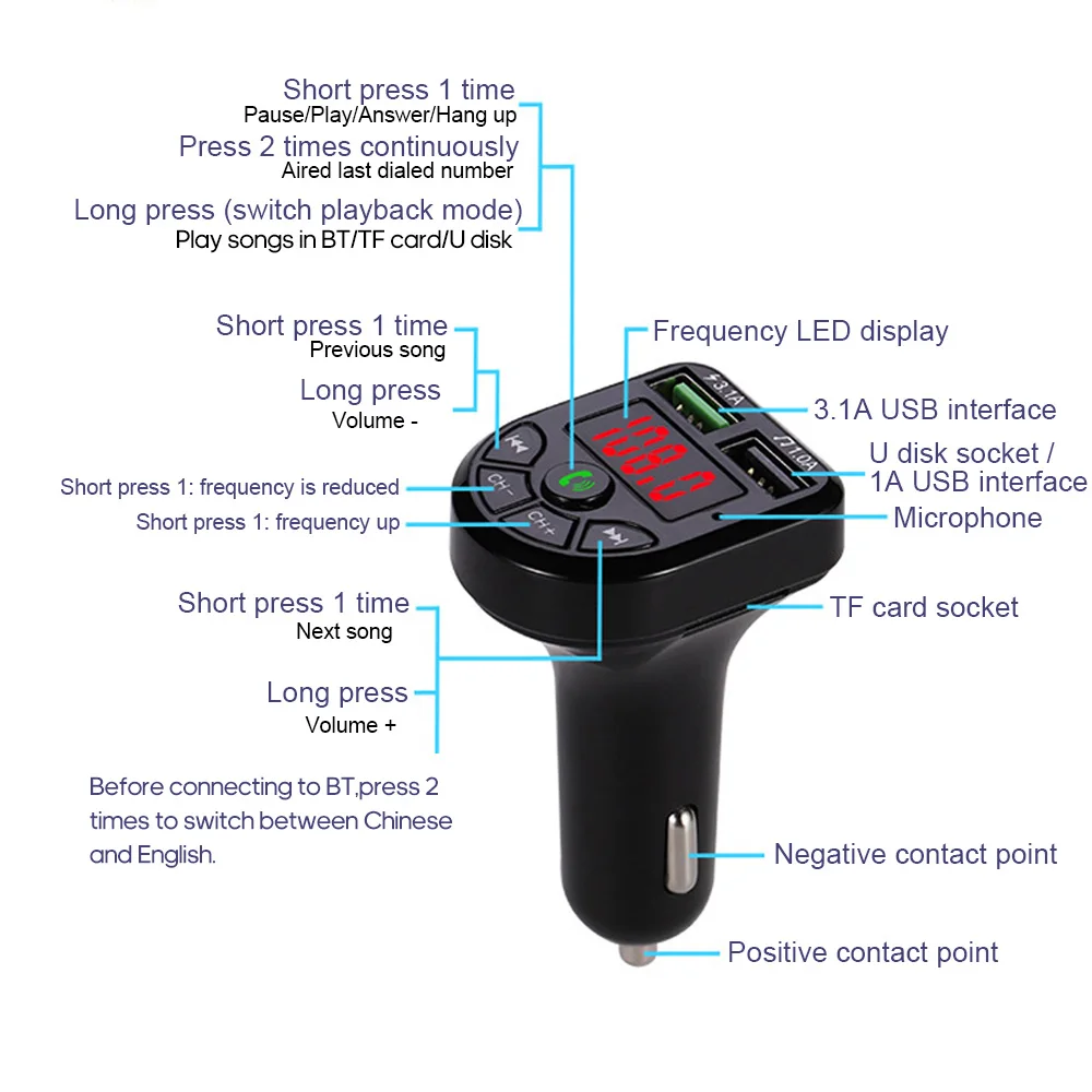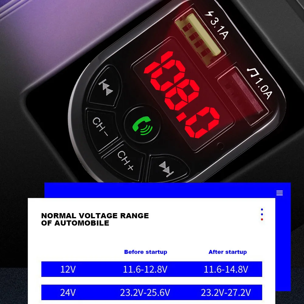 Особенности: Смартфоны могут быть подключены к устройству через BT. Поставляется с портом быстрой зарядки 3,1 а для одновременной высокоскоростной зарядки для водителя и пассажиров. Поддержка u-диска, tf-карты и мобильный телефон воспроизведения музыки Беспроводные звонки через BT соединение, что обеспечивает безопасное вождение. Поддержка воспроизведения навигационной информации. Поддержка FM полночастотной функции передачи 87,5-108,0 МГц. Технические характеристики: Версия BT: V5.0 + EDR Частота: 20h-20 кГц Чувствительность: -92dBm Эффективный диапазон: 5 м Напряжение: 5 ± 0,5 V Выходное напряжение: 1000 мА (макс.) Частота передачи FM: 87,5-108,0 МГц Размер посылка: прибл. 120*90*50 мм/4,72*3,54 * 1.97in Вес посылка: прибл. 63 г/2,22 унций Упаковочный лист: 1 * автомобильный mp3-плеер 1 * Руководство пользователя (китайский и английский)