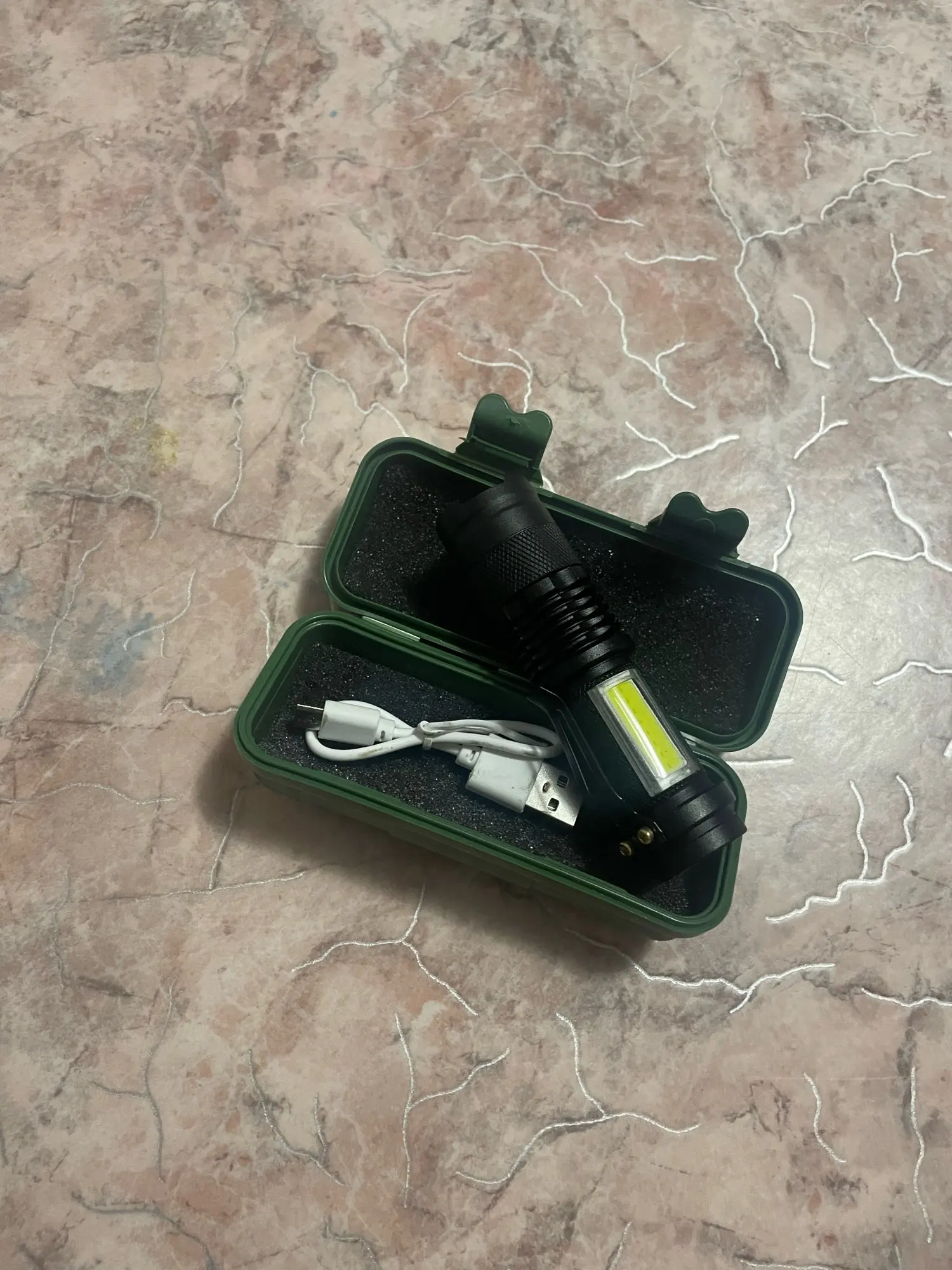 Фонарик куплен был по халяве. Доставили быстро, но правда в другой постамат другой Пятёрочки. Фонарик небольшого размера, с клипсой на боку и зумом, но для своего размера светит достаточно ярко, зум работает как нужно. Аккумулятор пока показался не очень ёмким, но может ещё раскачается. В комплекте только зарядный кабель. Магазин и товар однозначно рекомендую!