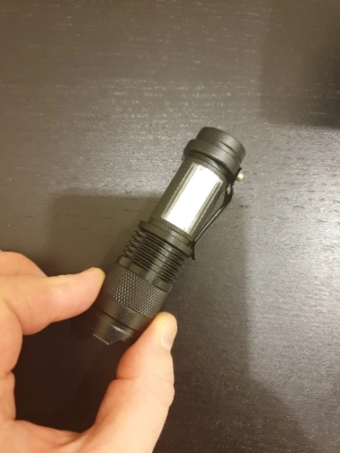 Сначала про доставку. Ээкспресс доставка, это доставка DPD, и отправили заказ в непонятное место далеко от дома, найти его оказалось очень трудно, я три раза обежала дом, что бы найти этот пункт выдачи, опознавательный знак оказался вобще практически незаметным, ПВ находился в подвале дома. Фонарик стоит своих денег! Светит очень ярко, имеет несколько режимов: основной свет (мерцающий и постоянный). У основного есть два вида света - рассеянный и луч. Боковой элемент дает очень рассеянный и приятный свет теплого оттенка (основной холодного оттенка). Заряжается с нуля около 5 часов, что говорит о неплохой емкости аккума. Размер примерно с ладонь, очень компактный. Есть рычажок для подвески, к примеру, на ремень. Но его можно открутить при надобности (на двух болтах). Нагревается при продолжительной работе. В зиму это плюс, можно руки греть. Но в вопросе безопасности нужно быть осторожнее. Несмотря на то, что корпус из металла. Возможно решается сменой акка на более мощный.