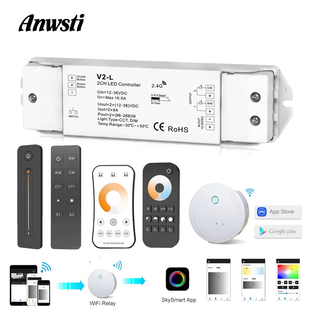 WW CW Светодиодный контроллер Wifi Smart RF беспроводной 2,4G пульт дистанционного управления 12В 24В 36В 2CH CCT светодиодный диммер для одноцветной CT светодиодный
