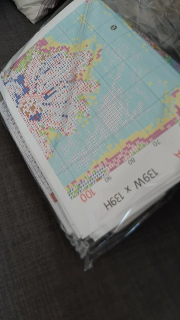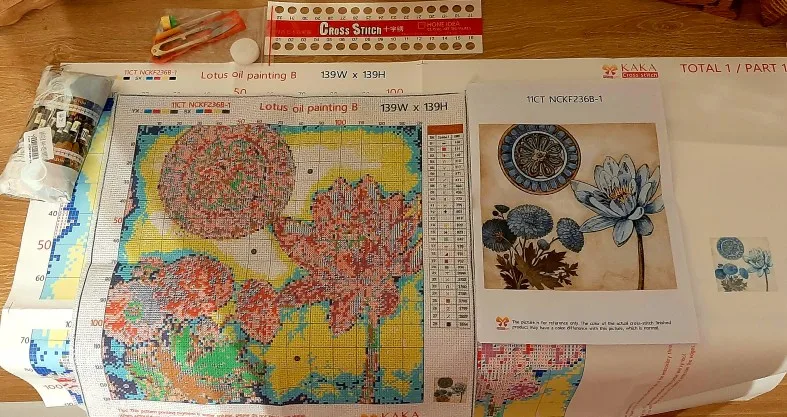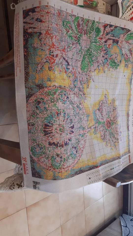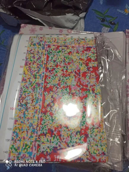 Из плюсов: быстрая доставка в Тулу - 13 дней с учетом Новогодних праздников (23.12.20-05.01.21). Продавец в каждый набор положил комплект инструментов, большинством я даже не знаю, как пользоваться). Ниток много, цвета яркие, схема понятная, канва плотная, края обработаны. Из минусов: отправили в пакетах, а не в розовой коробочке, как показывали здесь. Все помялось. Если бы я хотела подарить эту вышивку кому-то, то меня бы постигло разочарование, но я брала для себя. Размер готовой работы 31х31 см вместо 40, указанные 40х40 - это размер канвы с бортиками, без вышивки. Извините за сантиметр без 0 и за кривые фото - пыталась удержать завивающийся сантиметр одной рукой и фотографировать другой. P.s. Ни разу не вышивала на цветной канве, надеюсь белые нитки перекроют синий цвет канвы х)