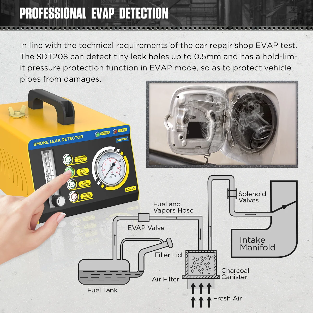 AUTOOL SDT208 автомобильный детектор утечки дыма EVAP System Test er-чудесный профессиональный тестер утечки дыма для автомобильных труб, в соответствии с техническими характеристиками тестирования EVAP в ремонтном магазине автомобилей. SDT208 значительно повышает эффективность и помогает нам находить утечки от автомобилей и мотоциклов в нашей системе трубопроводов в течение нескольких минут, быстро и точно, например, тест Системы EVAP, испытание системы впуска, испытание выхлопной системы, турбо тест системы, тест системы Картера, тест запечатывания автомобиля, различные трубы фитинги тест.