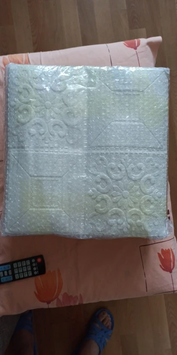 плитка пришла почти не мятая, сложена была по швам. но думала что она по толще. но она тонкая а так понравилась. посмотрю как будет клеится. потолок под нее нужен ровный. продавца рекомендую, доставка быстрая..