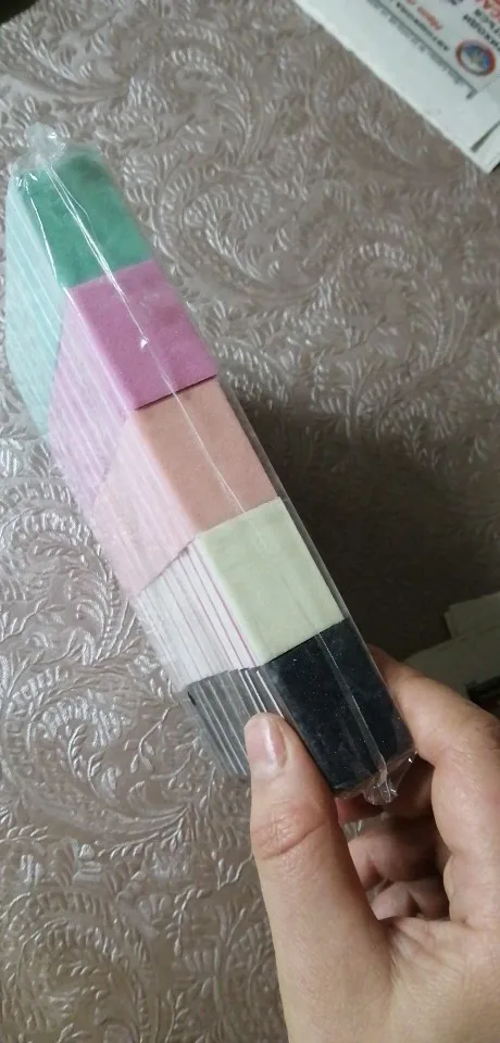 Замечательные бафы! Двусторонние. На фото это видно, положила 2 рядом разными сторонами для сравнения. С одной стороны крупная зернистость, с другой больше подойдёт для натурального ногтя. Чистенькие, чёткая форма, нежный приятный цвет. Брала набор 10 шт на пробу. Теперь закажу набор из 50 шт! Спасибо продавцу!!!!