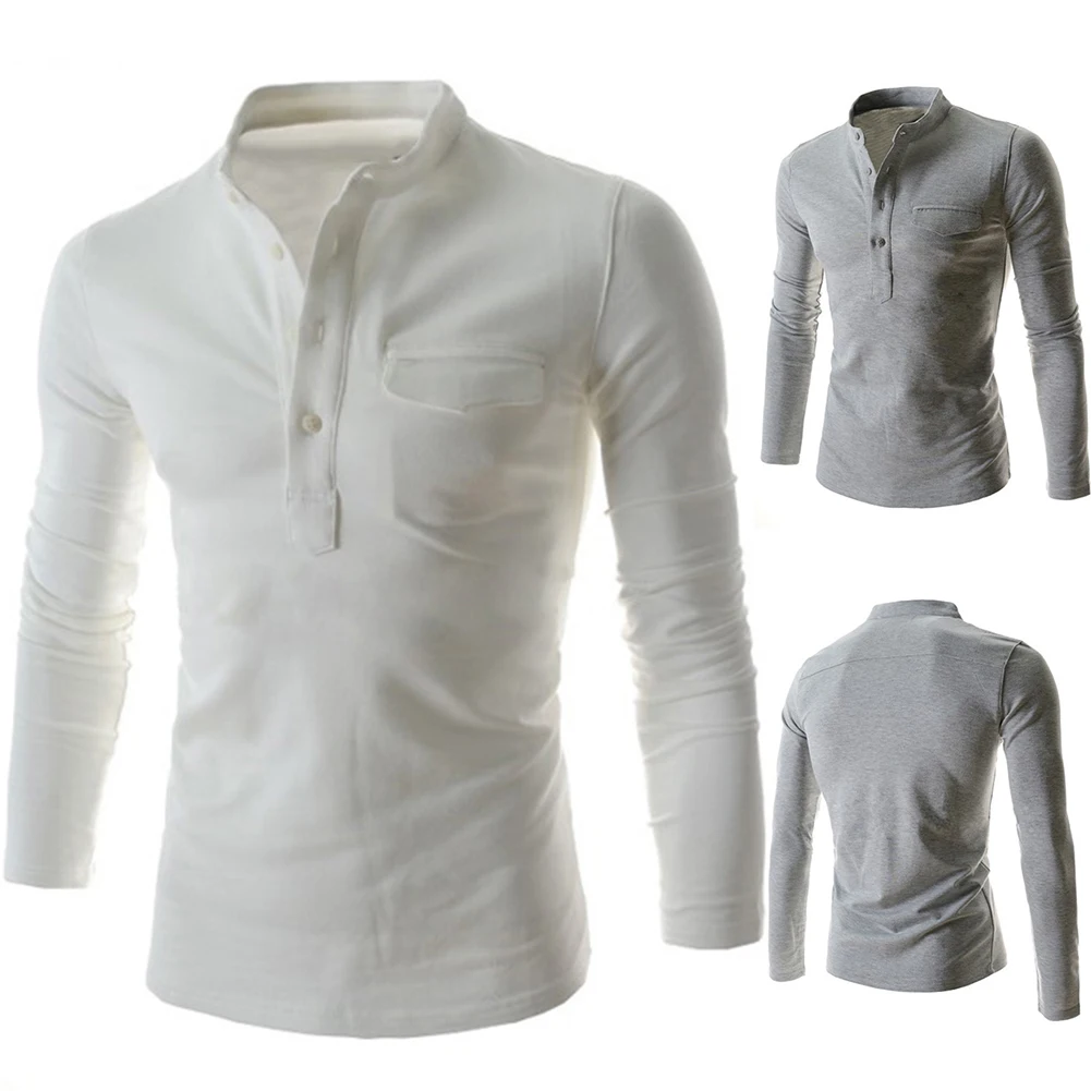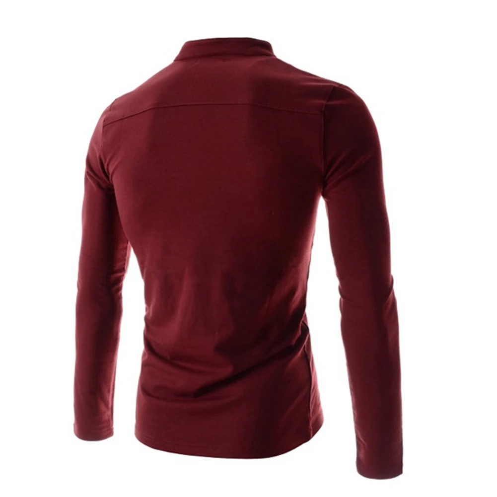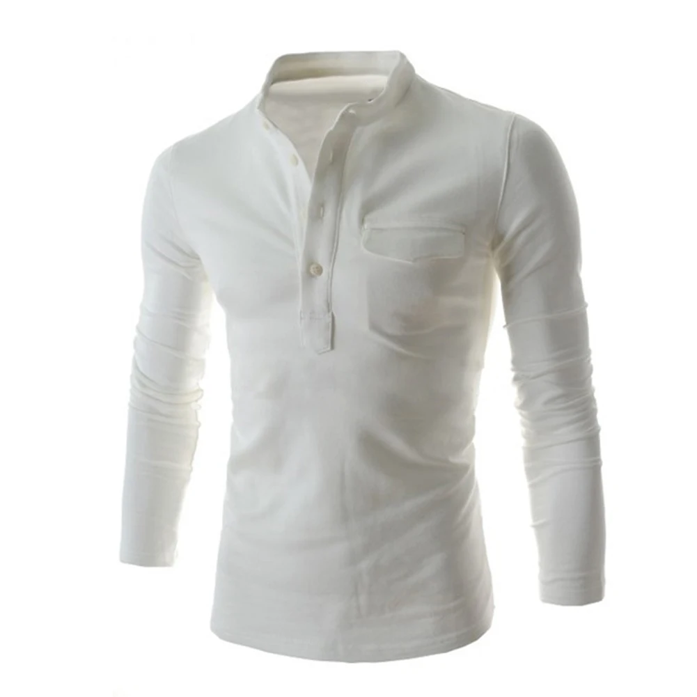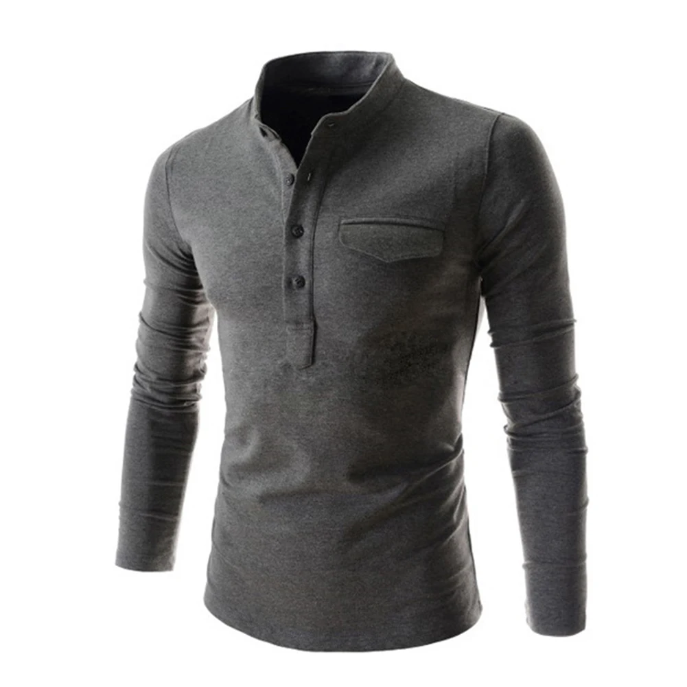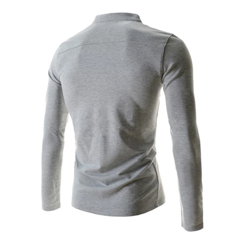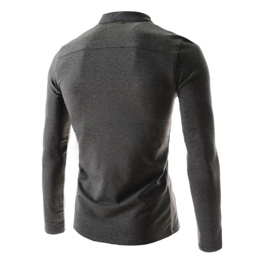 Футболка мужская с отложным воротником, Повседневная приталенная рубашка с длинными рукавами, на пуговицах, однотонная,