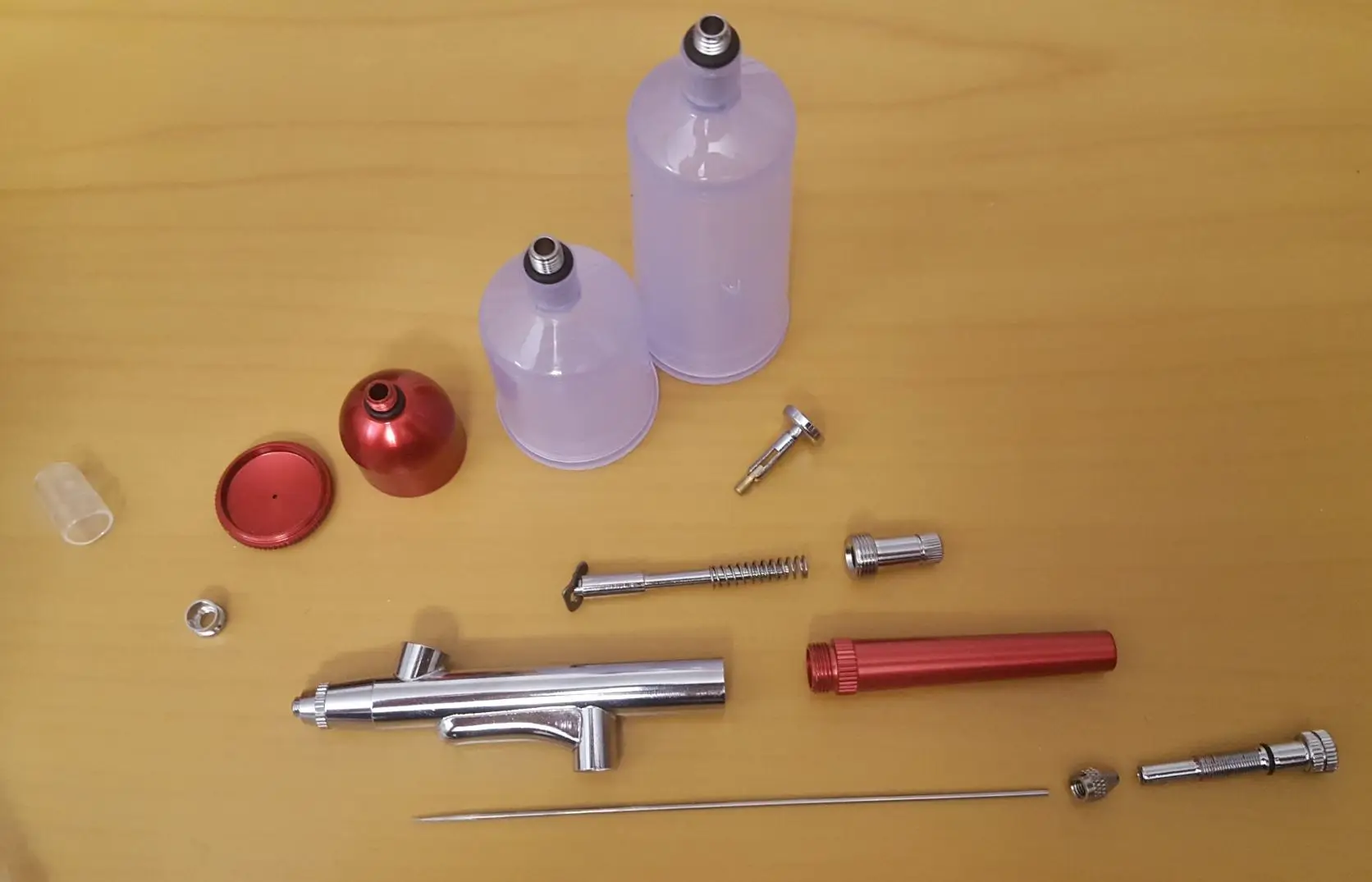 Простой однотактный аэрограф. Регулировка иглы в задней части, идет очень свободно, она должна быть жесткой. Я не мог отпустить крышку сопла пальцами, поэтому я не увидел всю насадку. Заказал 5 февраля 2021 года. Товар получен 26 февраля 2021 года. Описание является точным. Я очень доволен товаром, спасибо продавцу.