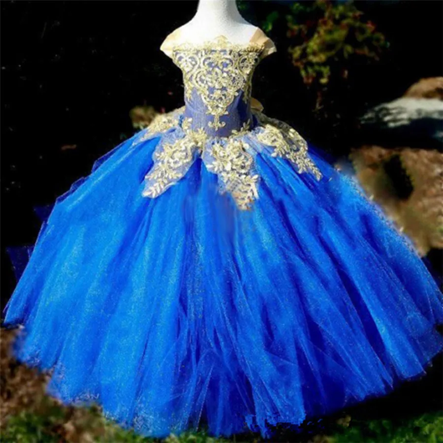 Элегантное Королевское синее Пышное Тюлевое платье принцессы для Девочки Кружевное бальное платье с аппликацией Цветочное платье для девочки Свадебные платья на день рождения