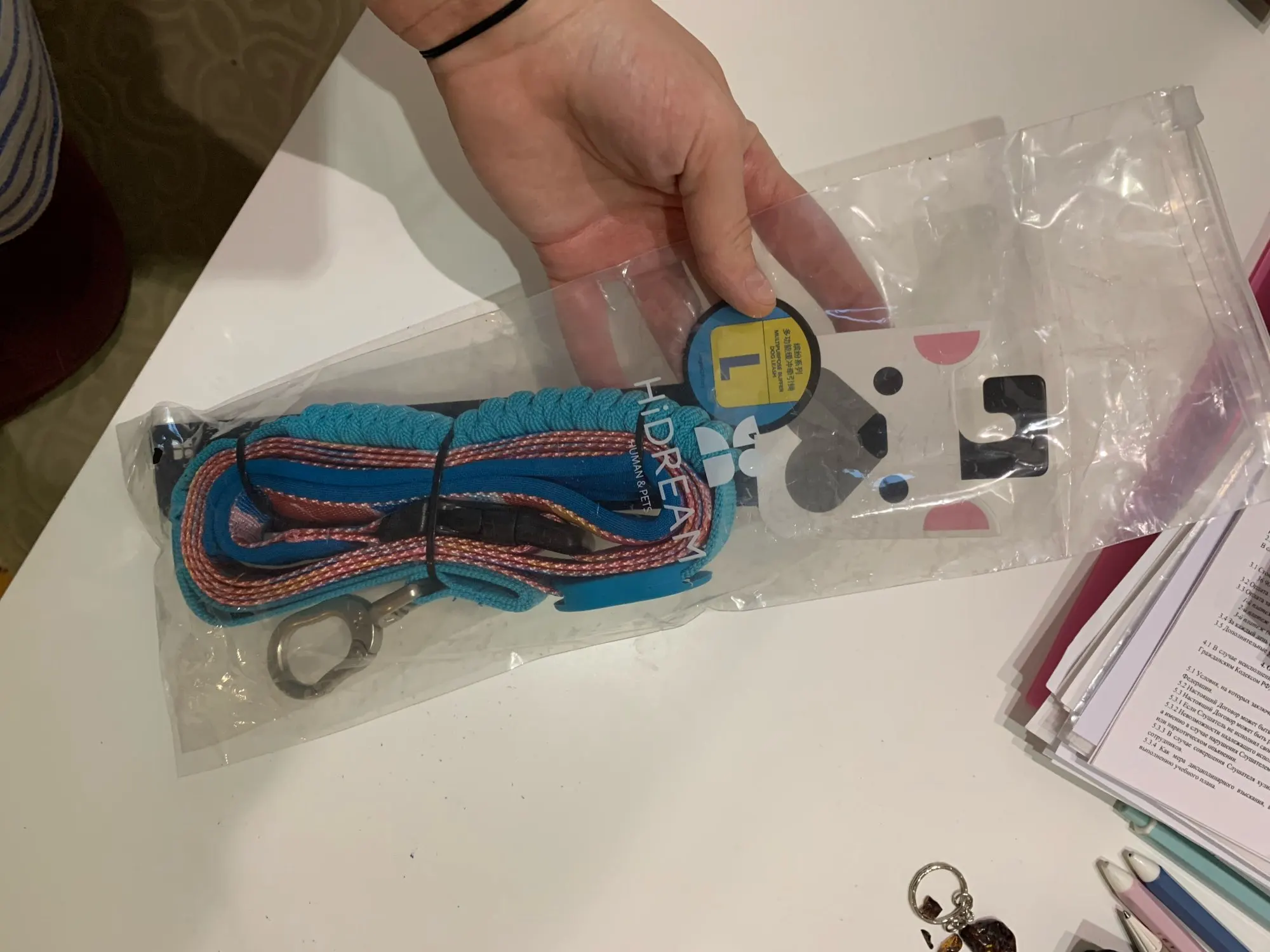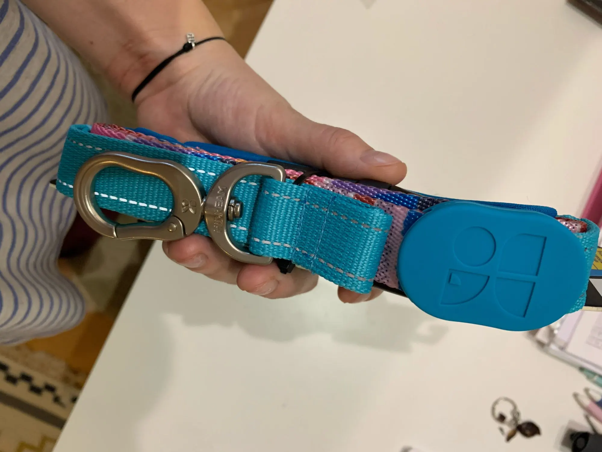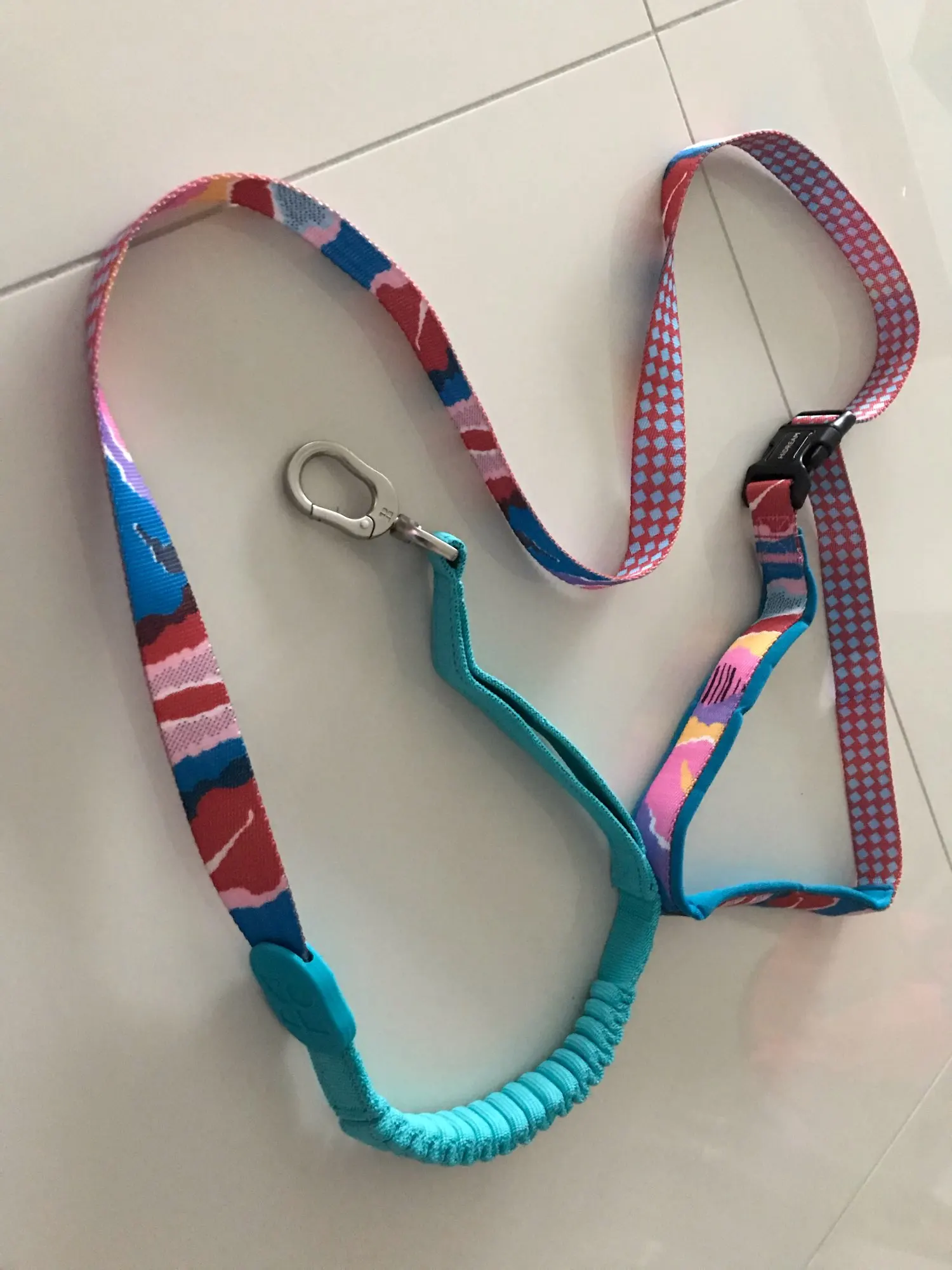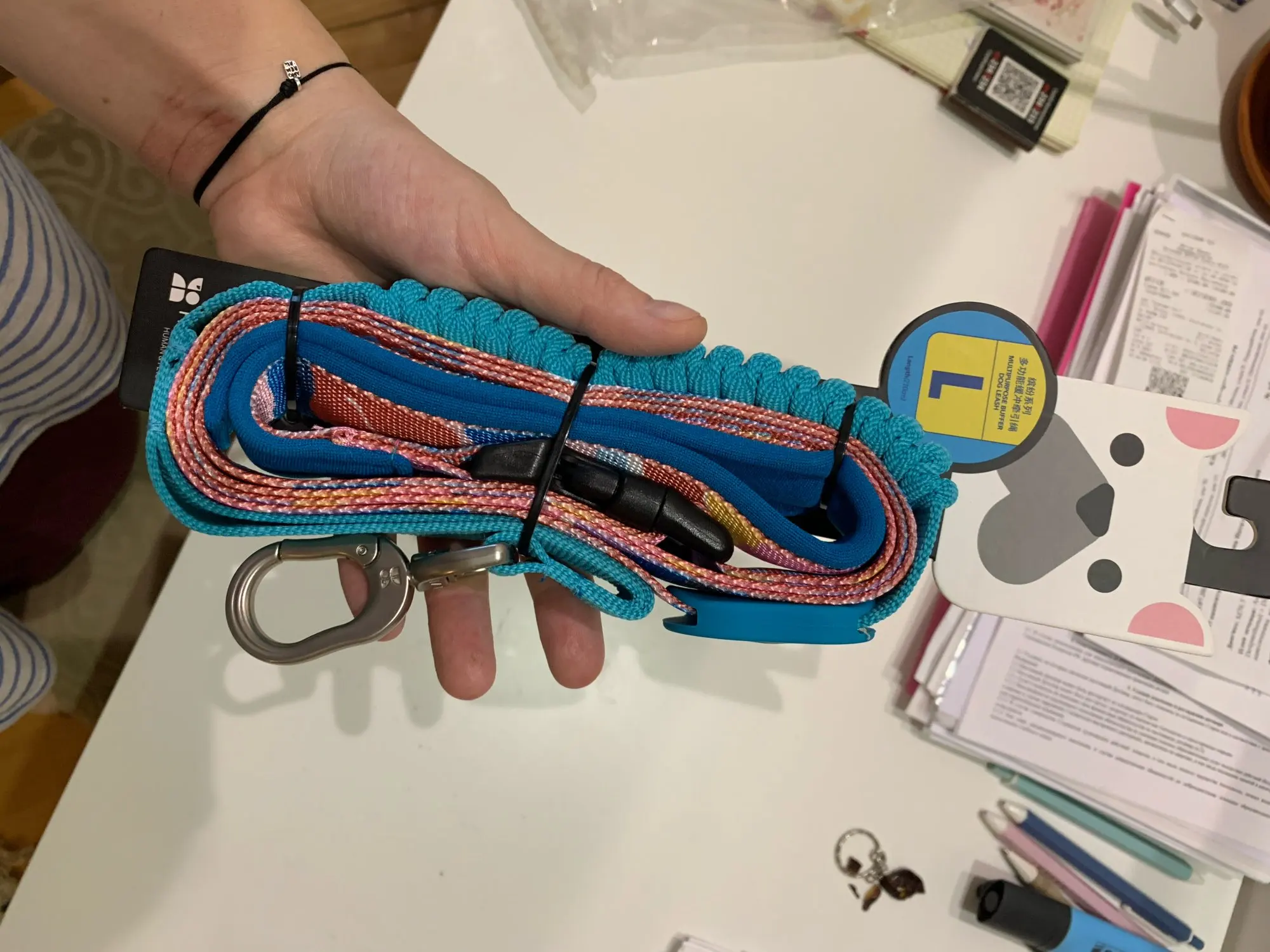 Очень красивый, хорошо сделанный поводок. Есть эластичная секция. Коротковат и очень тяжелый карабин для щенка, поэтому ждет своего часа :)
