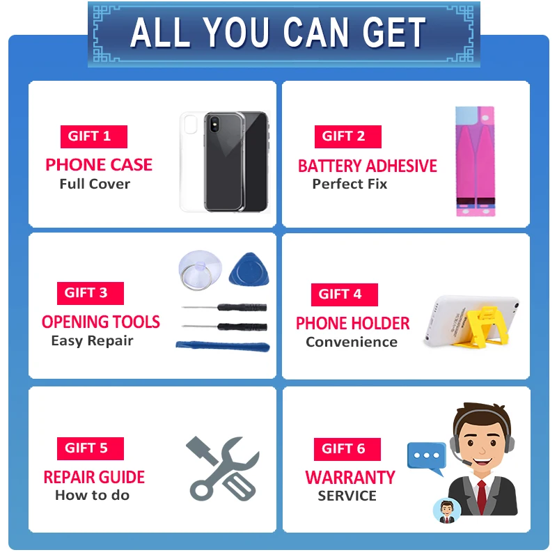 1 * литий-ионный аккумулятор для телефона 1 * чехол для телефона 1 * наклейка на батарею 1 * Набор инструментов для вскрытия 1 * держатель для телефона 1 * руководство по ремонту