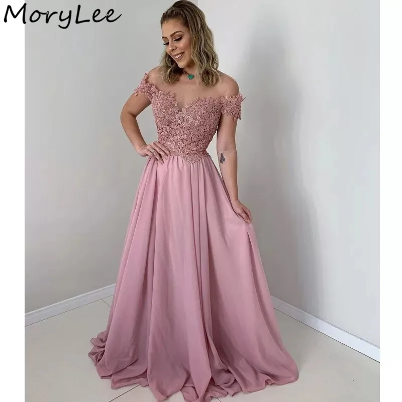 Розовые вечерние платья с открытыми плечами трапециевидной формы с коротким шлейфом кружевной с аппликацией шифоновый Вечерние Платья vestidos de fiesta de noche