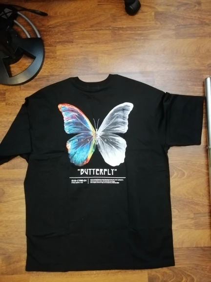 Товар выглядит точно так же, как на фото, цифровая печать на спине яркая против черного. Детали с принтом для экрана аккуратные, без пятен. Качество футболки хорошее. Куплю у вас снова.