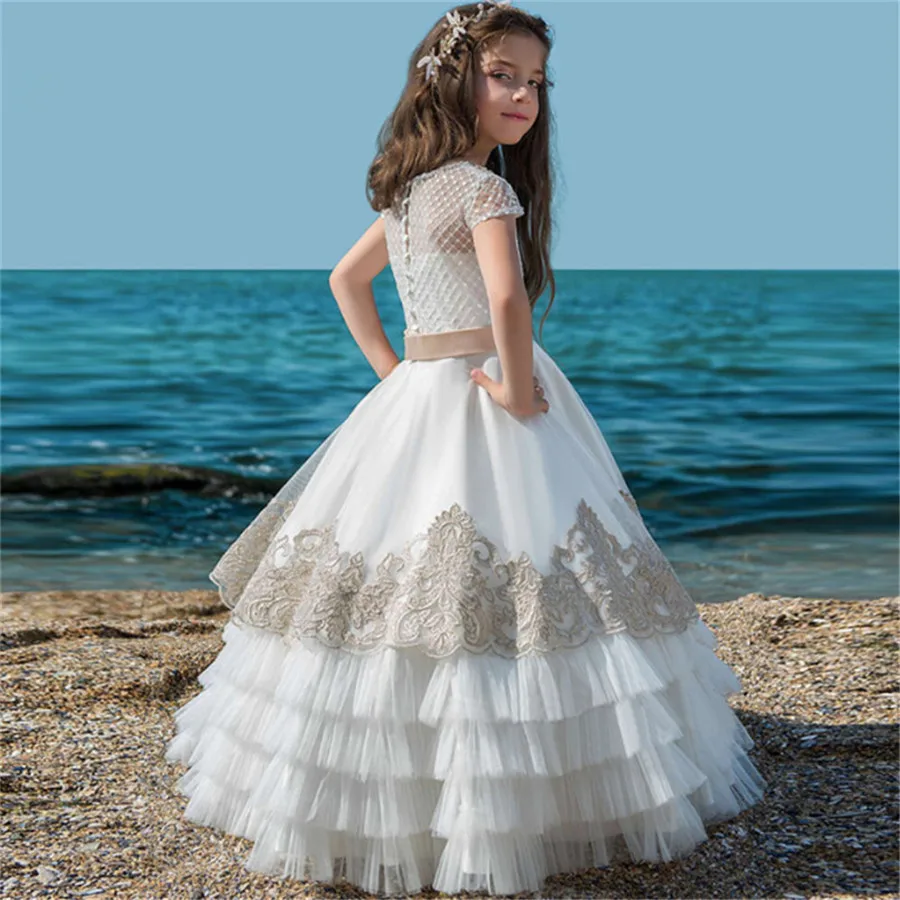 Платье принцессы с цветочным рисунком для девочек, кружевное бальное платье без рукавов с аппликацией, потрясающее милое платье для девочек на первое день Святого Причастия