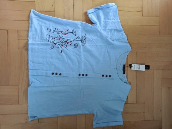 Блуза 100% хлопок, цвет и размер соответствует описанию, длина - закрывает тазовую область, рисунок - вышивка, пройма рукава достаточно широкая. Доставка в Санкт-Петербург - 10 дней. Цена...хм..купила в "черную пятницу" на 130 руб дороже цены на 10.12...(10,65$ против сейчас 9,30$)