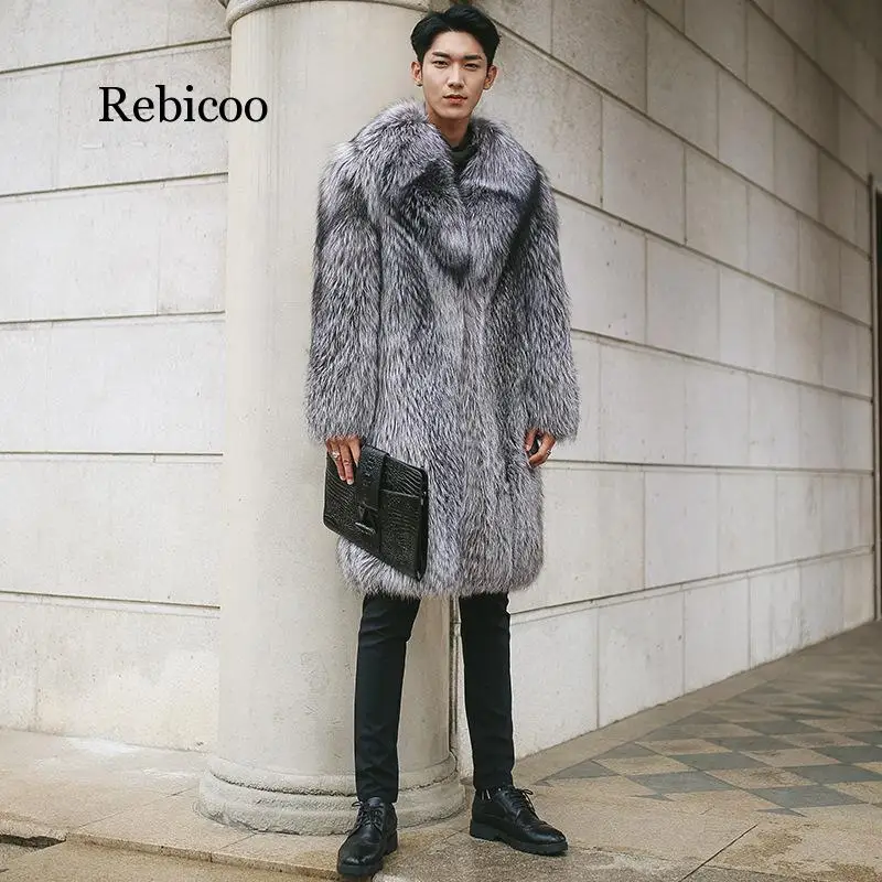 Мужское теплое длинное пальто, утепленная куртка из искусственного меха, длинная мужская шуба из лисьего меха