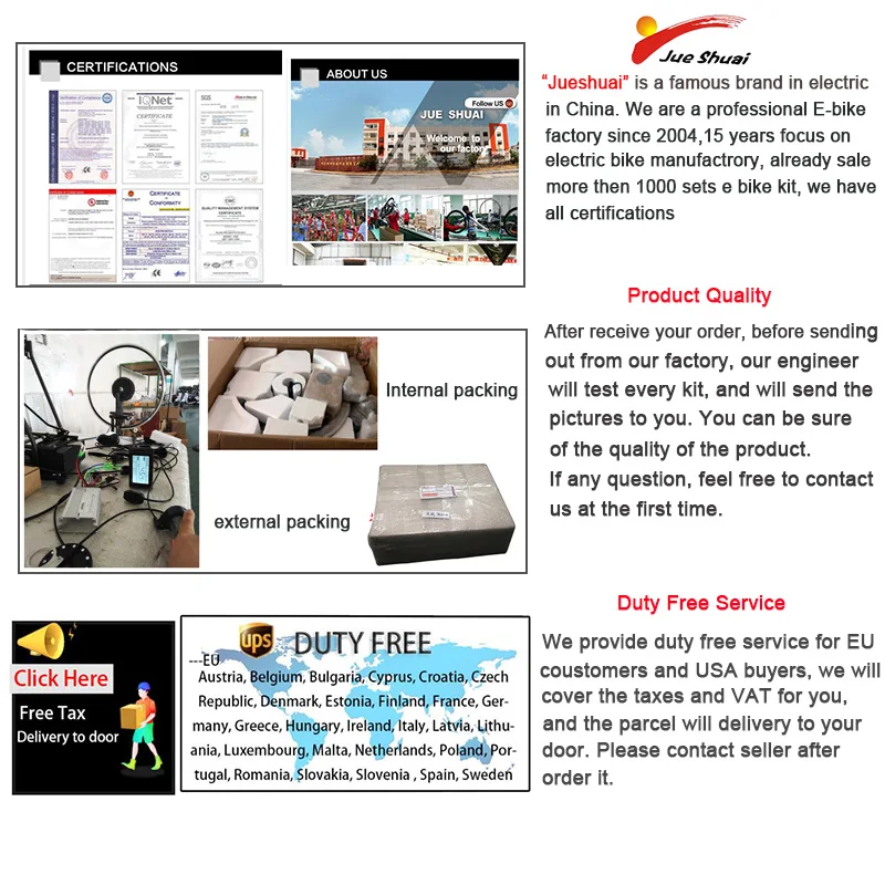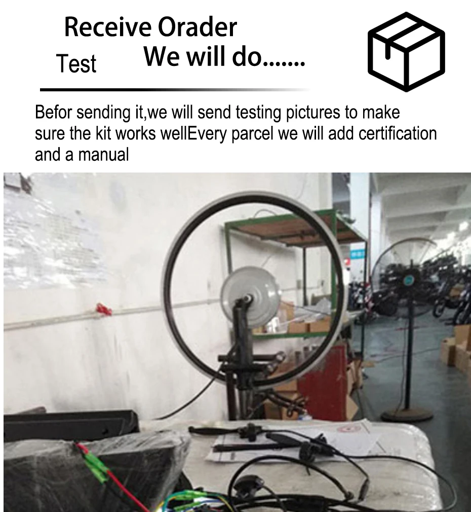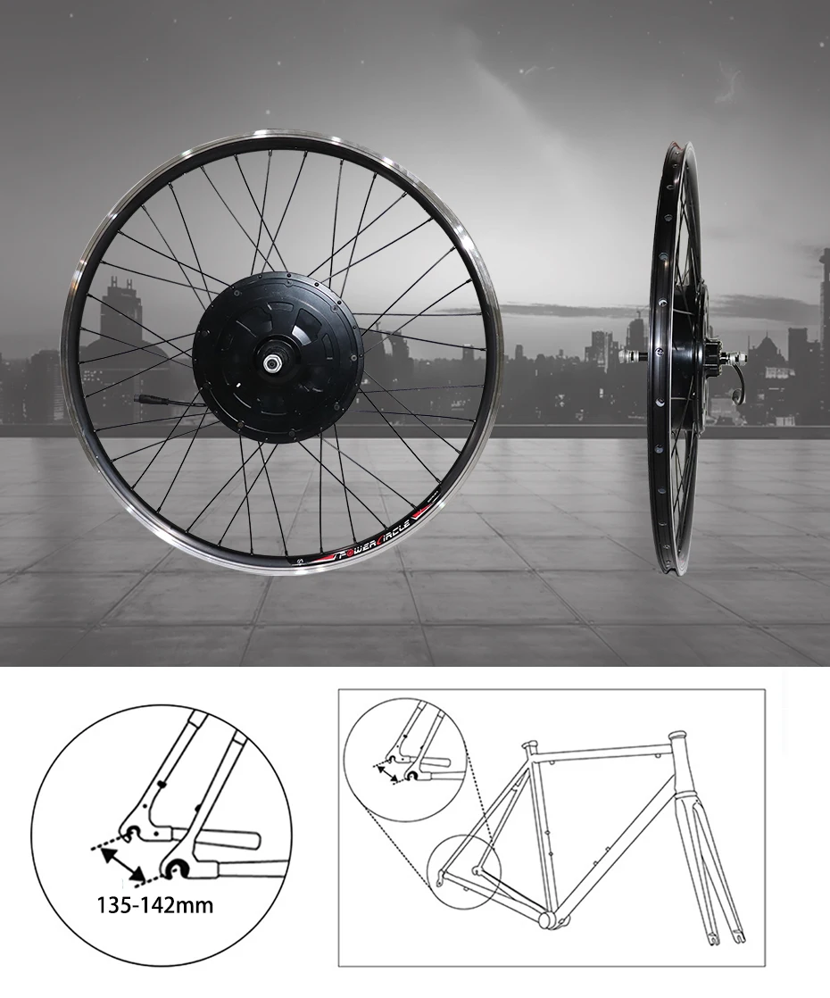Этот комплект поставляется со всем, что вам нужно для преобразования вашего велосипеда в электронный велосипед, кроме аккумулятора и зарядного устройства.Вот Упаковочный лист:1*48v 1000 Вт мотор для центрального движения колеса2 * Батарея (48V 13AH/ 48V 20AH/ 48V26AH/ Samsung48V26AH треугольная литиевая батарея с сумкой)3 * Зарядка литиевой батареи (европейский стандарт)Зарядное устройство: 100-240 В, 50-60 Гц вход, 2A смарт-зарядное устройство4 * Датчик скорости и датчик дисковой пластины (12 магнитов PAS)5 * S900LCD дисплей6 * Водонепроницаемый основной кабель7 * тормозные рычаги с отключением питания при применении/Датчик тормоза для гидравлического тормоза8 * дроссельная заслонка (дроссельная заслонка большого пальца или половина закрутки или закрутка дроссельной заслонки)9*48 В интеллектуальный контроллер с коробкой10 * подарок: головной светильник11 * другие аксессуарыПроизводительность* Максимальная скорость: 48-50 км/ч* Диапазон заряда: 30-40 км дроссельной заслонкой, 40-50 км PAS в зависимости от веса гонщиков, дорожных условий и т. Д.* Время зарядки: 4-6 часов в зависимости от предыдущего уровня заряда батареиТребования* Минимальная ширина задней вилки: 135-142 ммПосылка* Вес брутто/Вес нетто: 19/16 кг