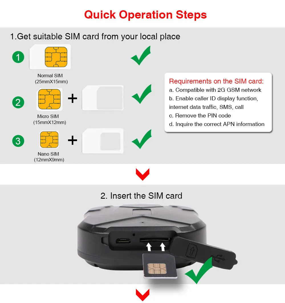 1. Это устройство должно работать с SIM-картой, пожалуйста, купите его у себя на месте.2. Убедитесь, что SIM-карта соответствует указанным ниже требованиям:* Включена функция отображения идентификатора звонящего, трафика интернет-данных* Разблокированный пин-код* С остальным балансом* Отключена функция передачи вызовов3. Если вы хотите включить устройство в приложении, получите точную правильную информацию APN от поставщика SIM-карт и настройте APN4. Пожалуйста, правильно Установите SIM-карту в соответствии с руководством пользователя