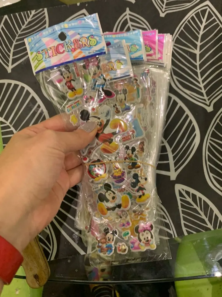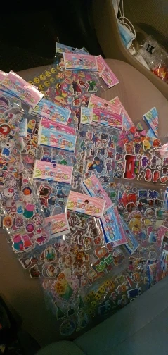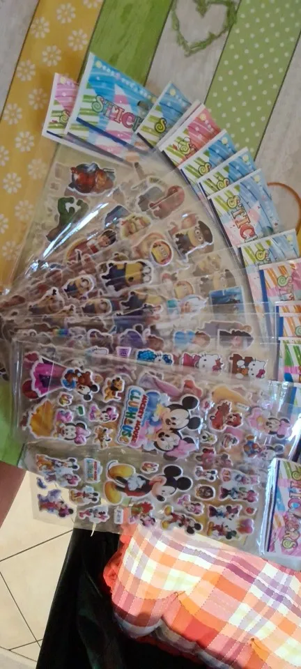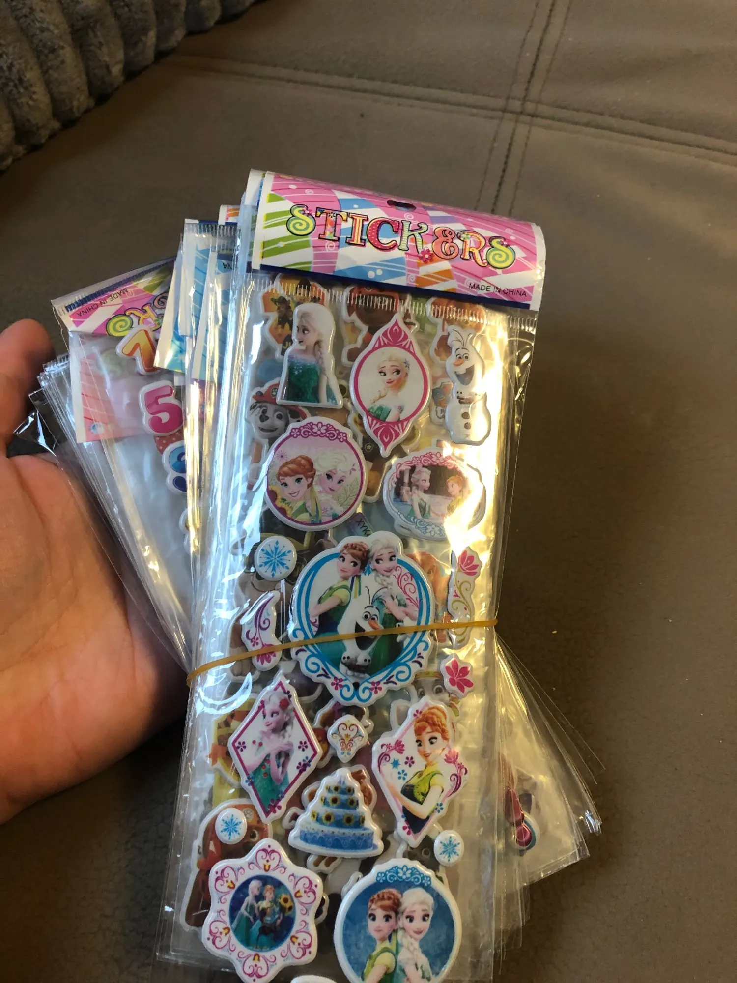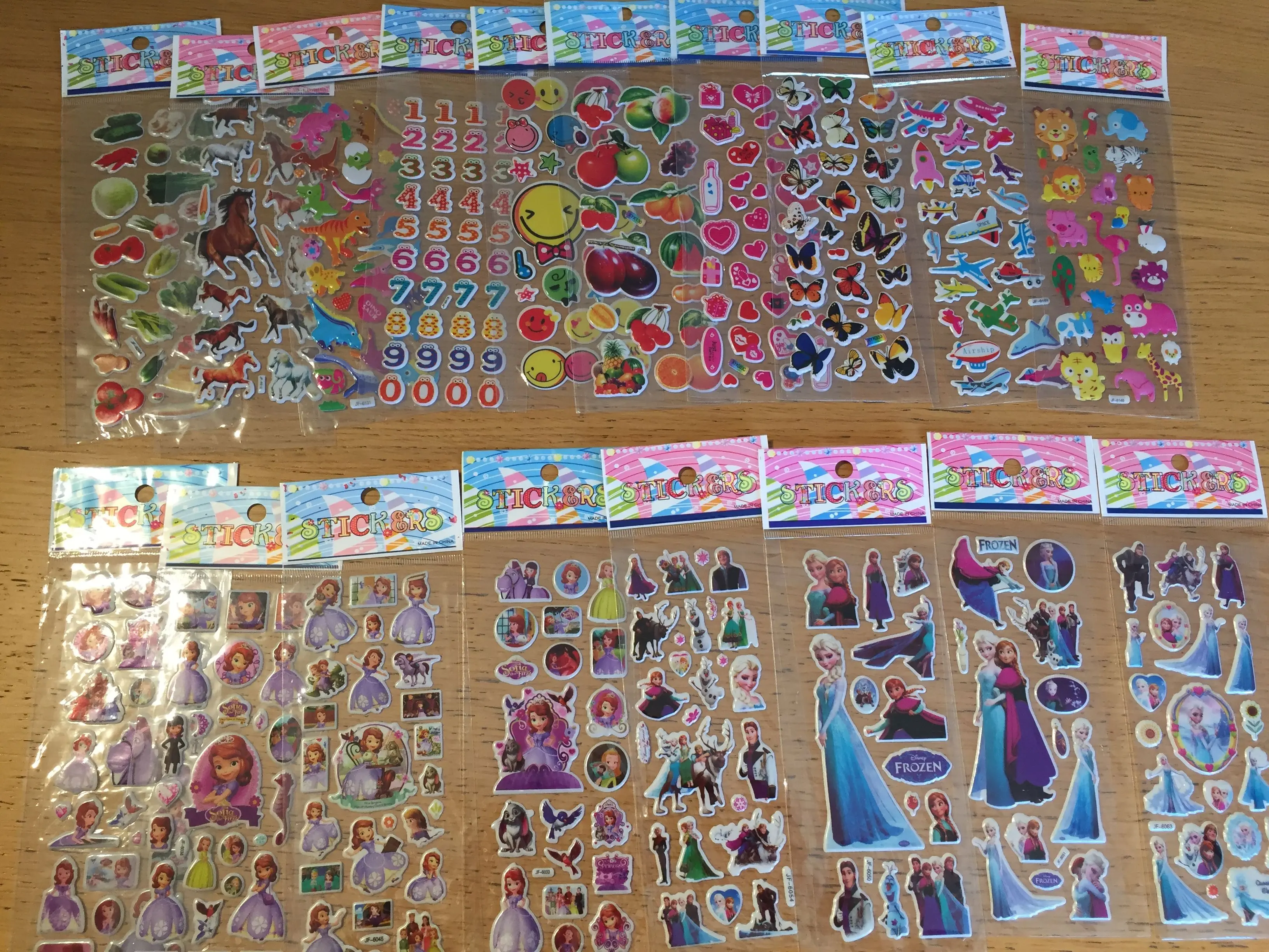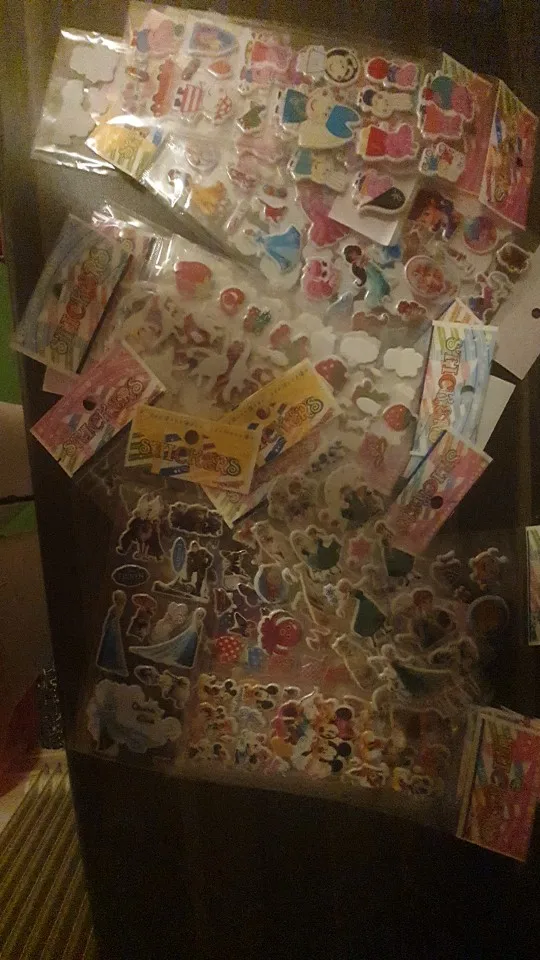 Огромная стопка наклеек. Всех по 2 листа каждого вида. Покупала для девочек и там принцессы, тролли, холодное сердце, микки и мини. 1 лист просто смайлики