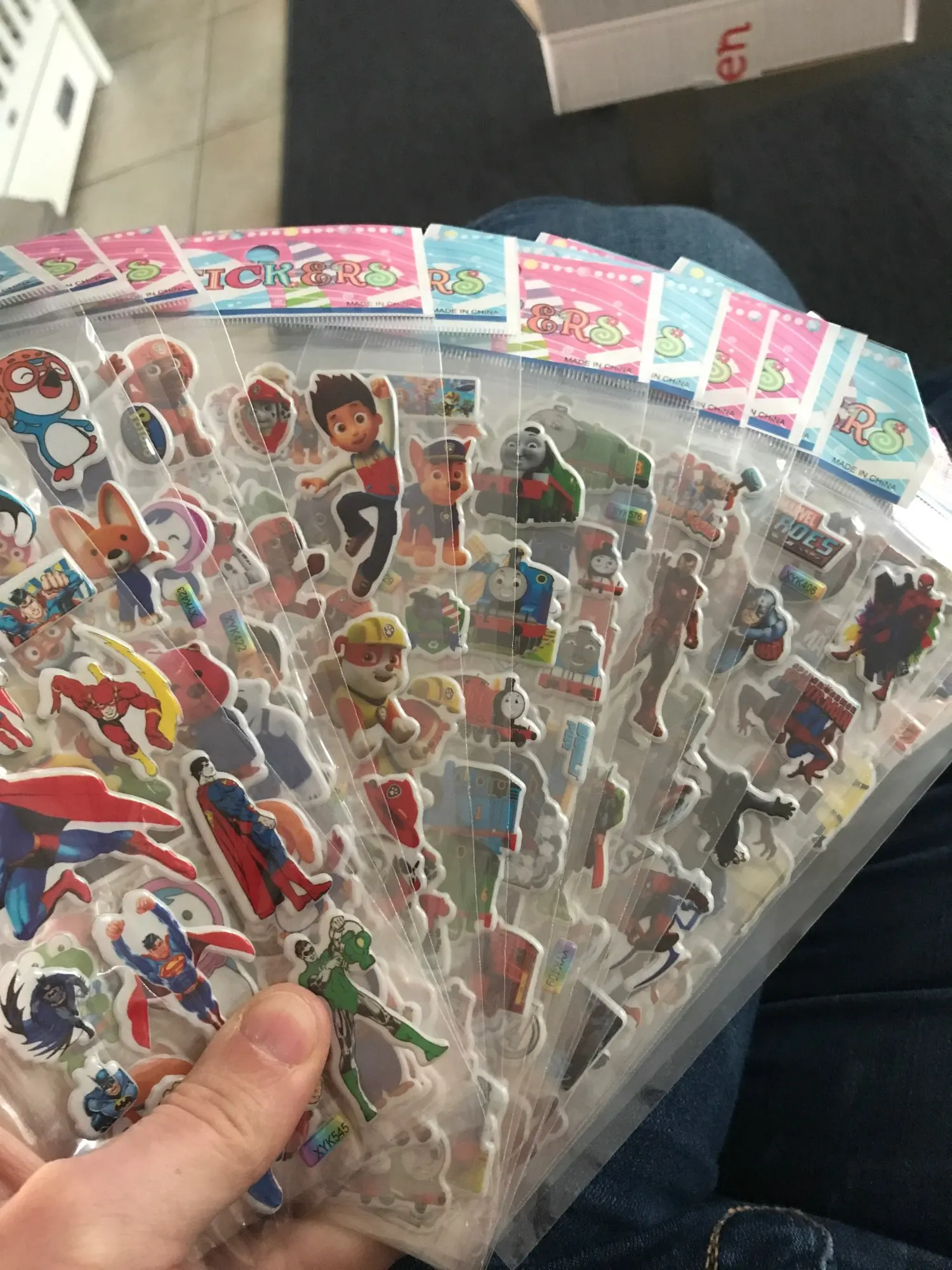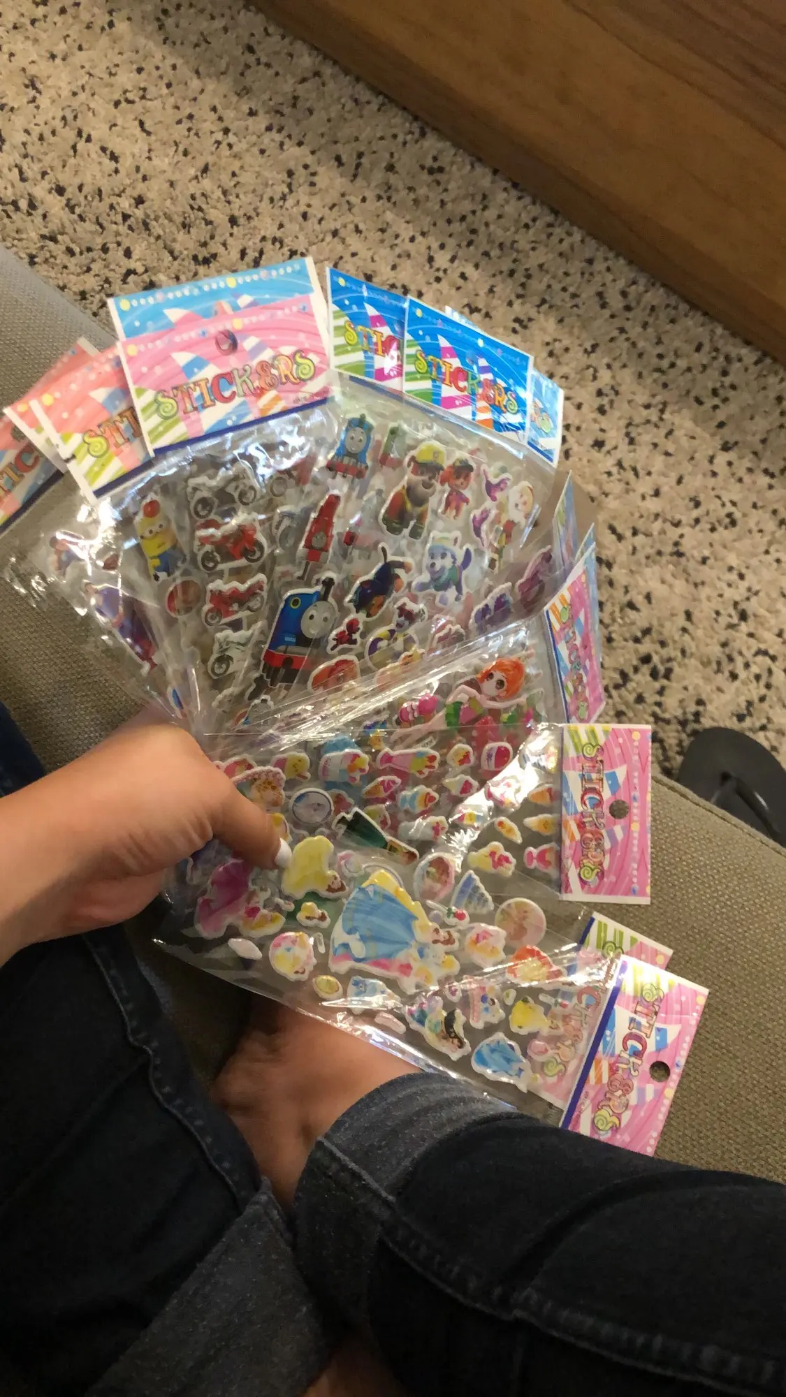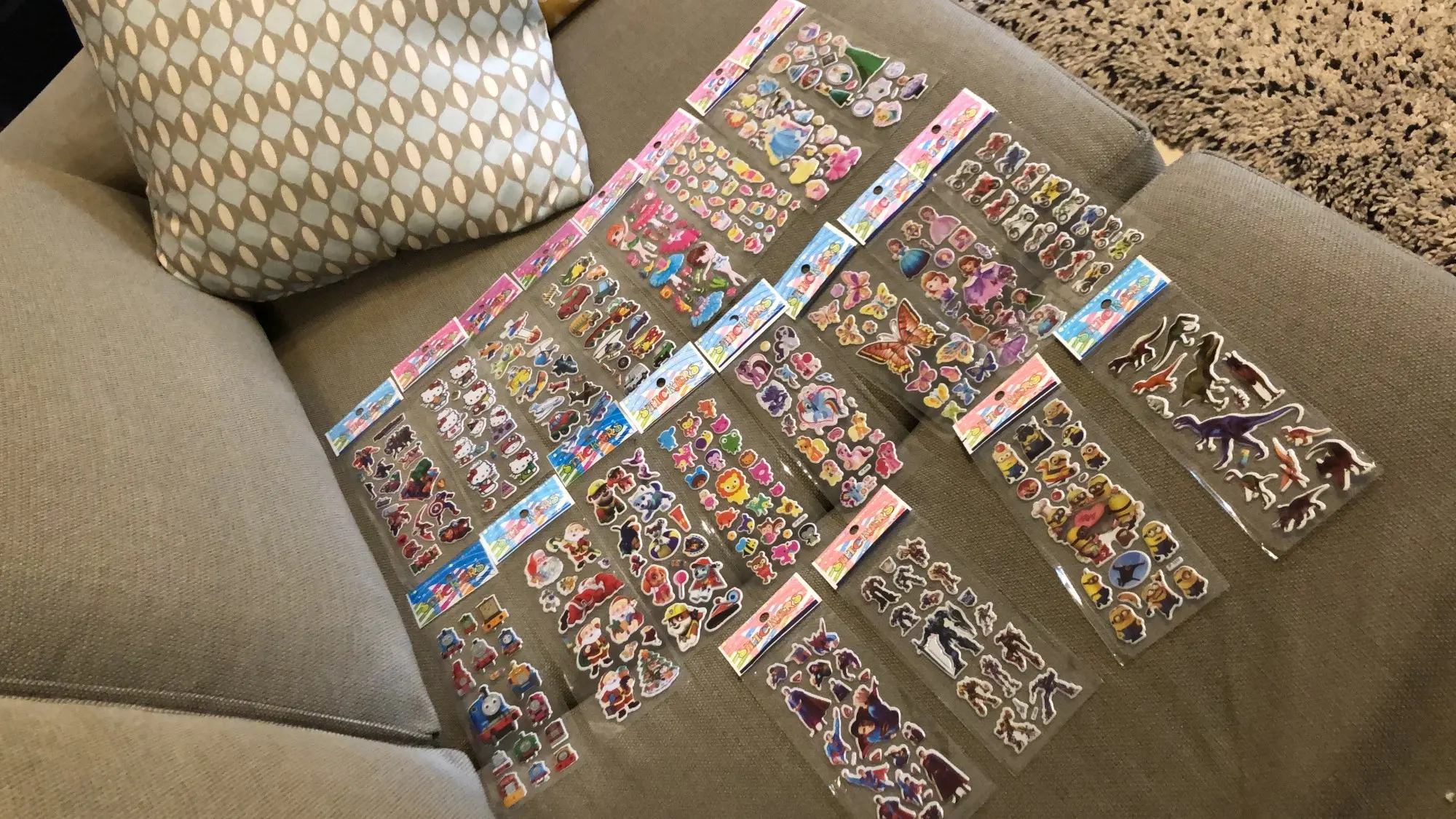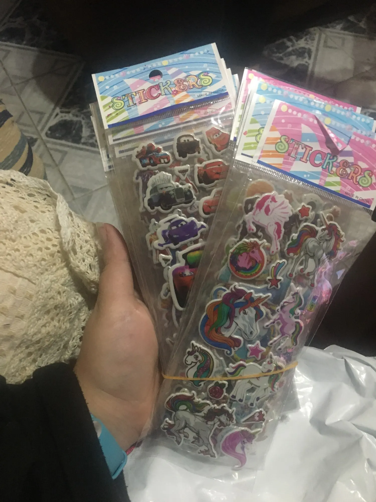 Огромная стопка наклеек. Всех по 2 листа каждого вида. Покупала для девочек и там принцессы, тролли, холодное сердце, микки и мини. 1 лист просто смайлики