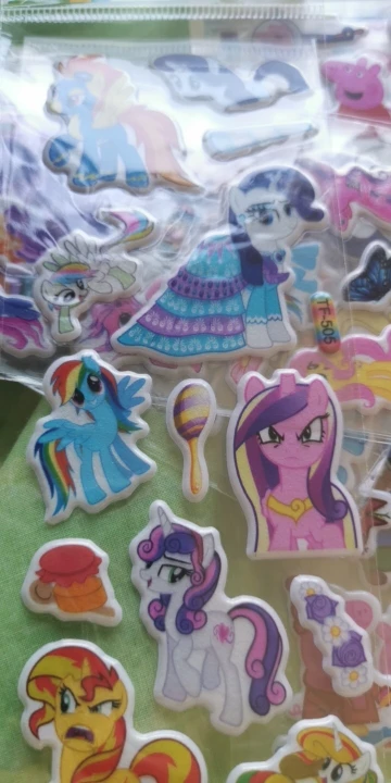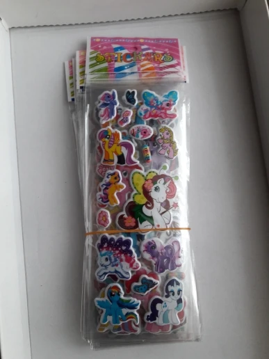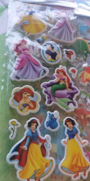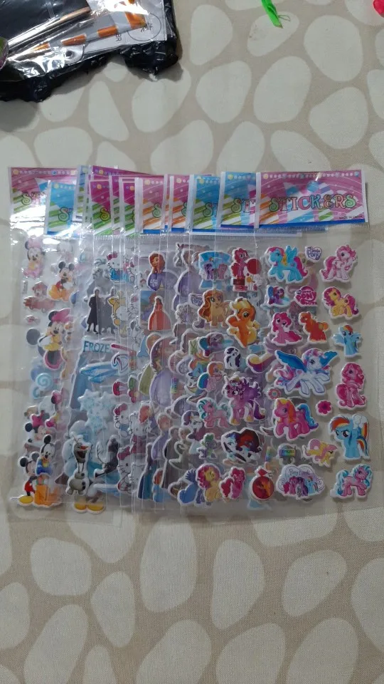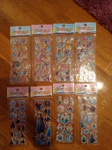 ни одной повторяющейся наклейки, это плюс. но всего лишь 5 тем наклеек: микки маус, софия, холодное сердце, пони и хелоу китти. хотелось бы разнообразней