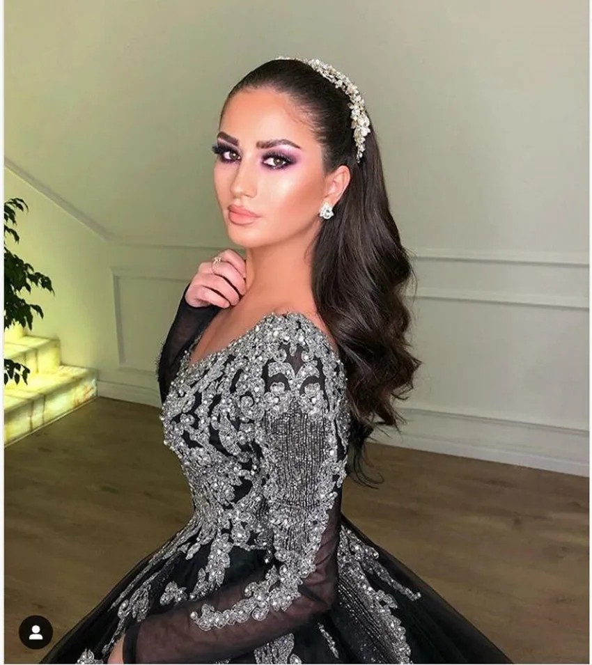 Винтажное Черное вечернее платье с кристаллами, с длинными рукавами, блестящее бальное платье-пачка с v-образным вырезом, длинное вечернее платье