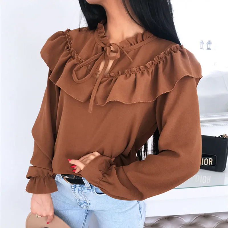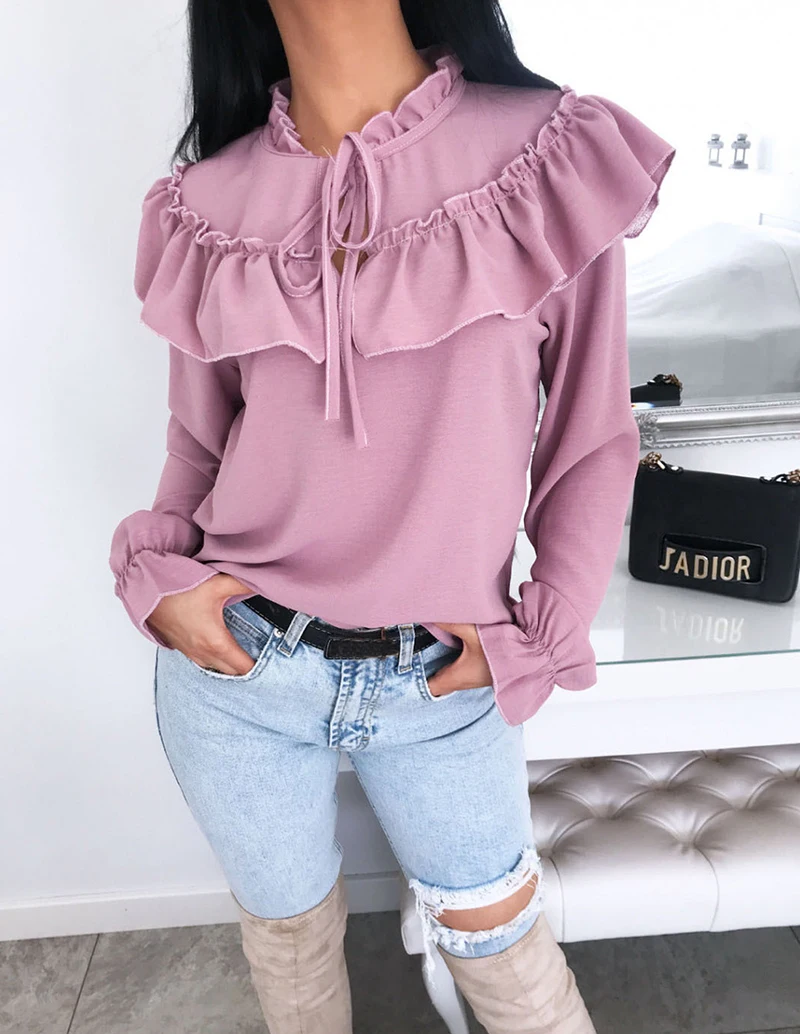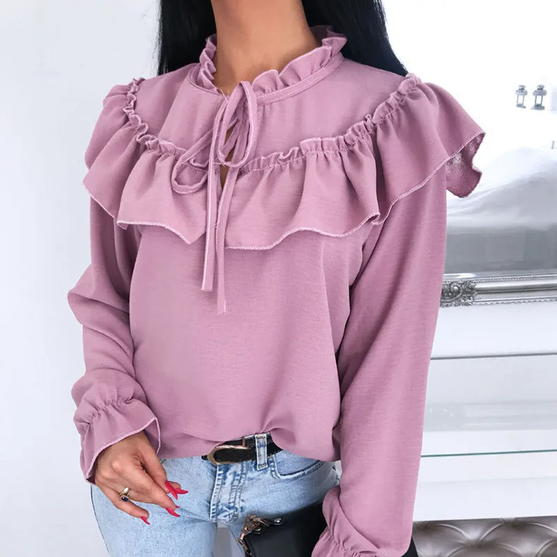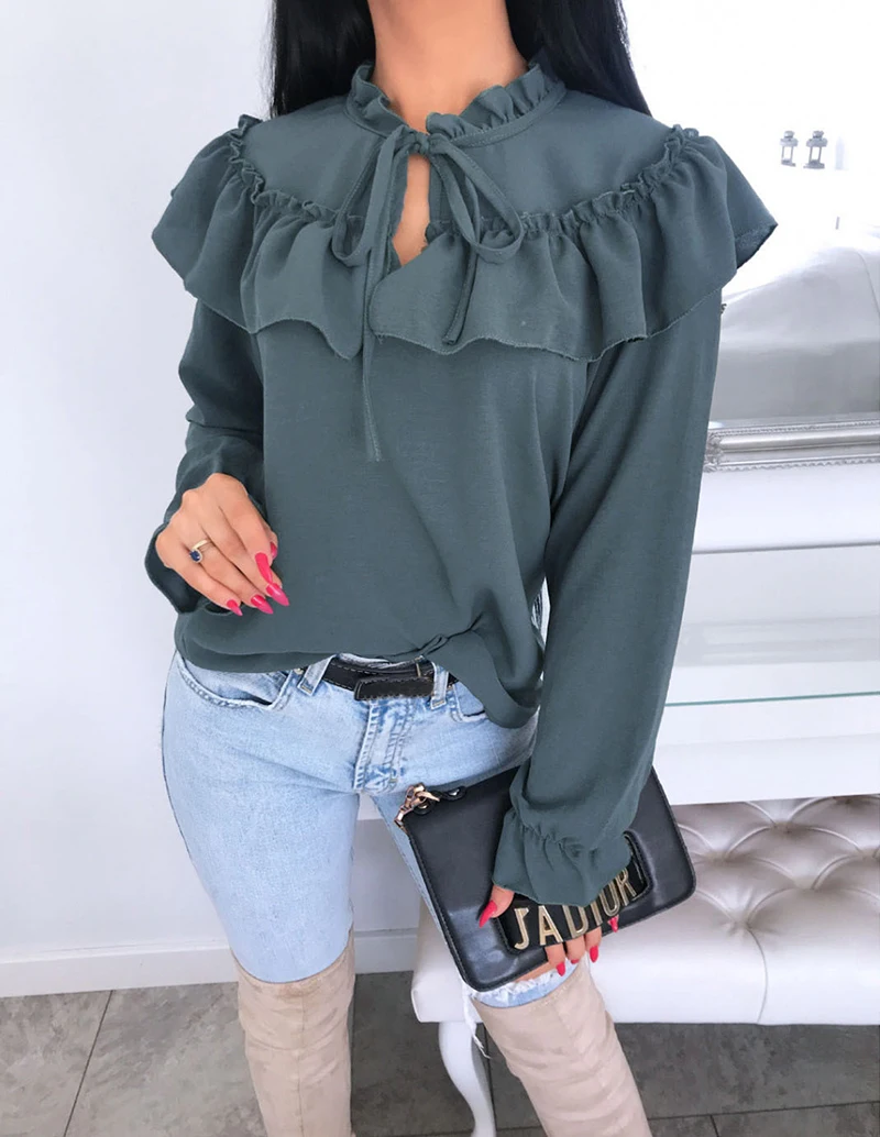 Женская блузка с оборками, длинным рукавом и вырезом лодочкой